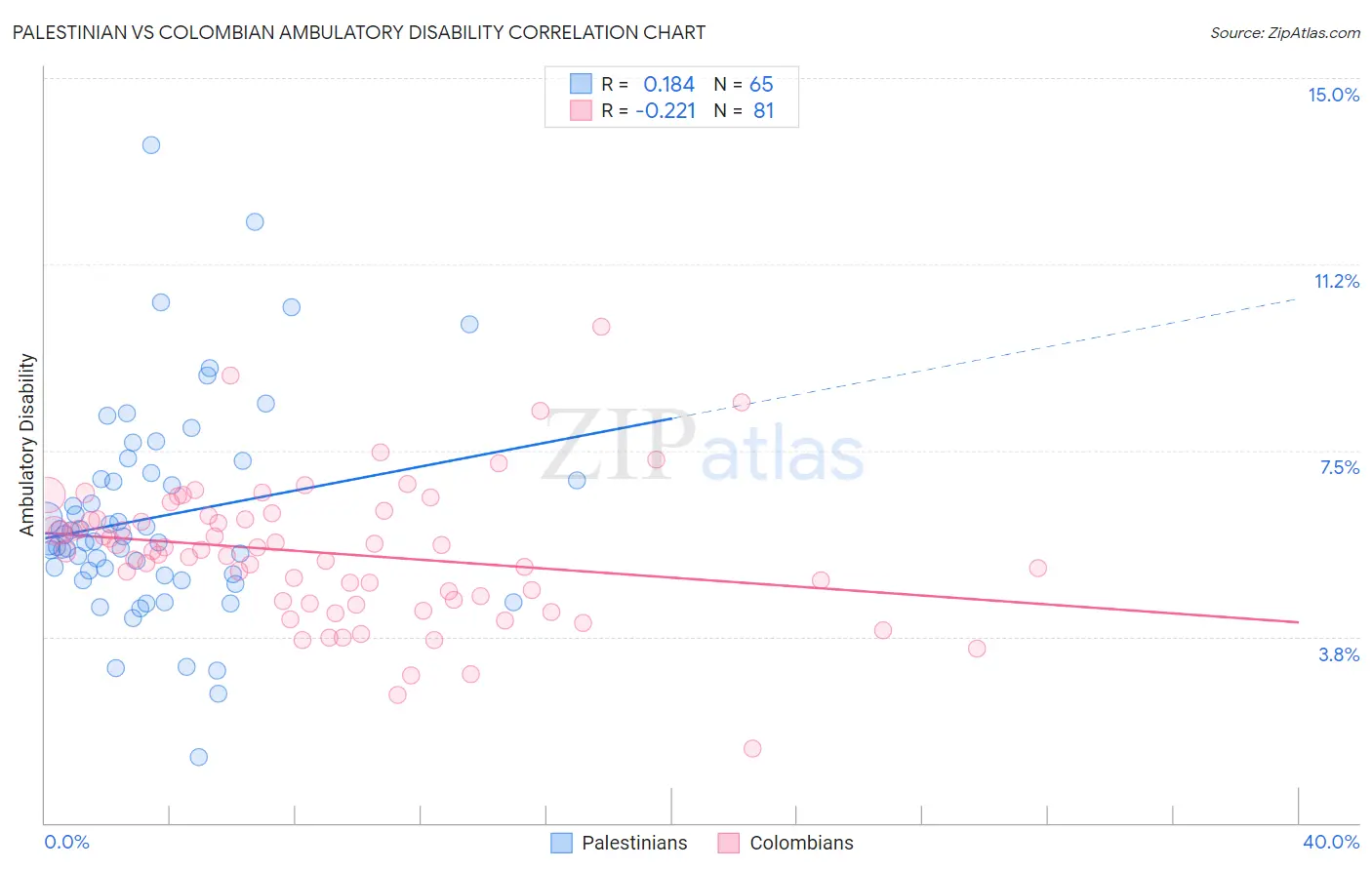The statistical analysis conducted on geographies consisting of 216,450,834 people shows a poor positive correlation between the proportion of Palestinians and percentage of population with ambulatory disability in the United States with a correlation coefficient (R) of 0.184 and weighted average of 5.7%. Similarly, the statistical analysis conducted on geographies consisting of 419,485,288 people shows a weak negative correlation between the proportion of Colombians and percentage of population with ambulatory disability in the United States with a correlation coefficient (R) of -0.221 and weighted average of 5.8%, a difference of 1.8%.