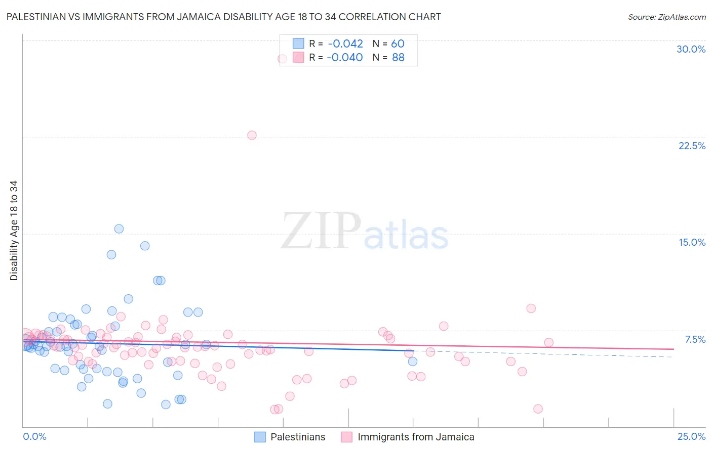 Palestinian vs Immigrants from Jamaica Disability Age 18 to 34 Correlation Chart