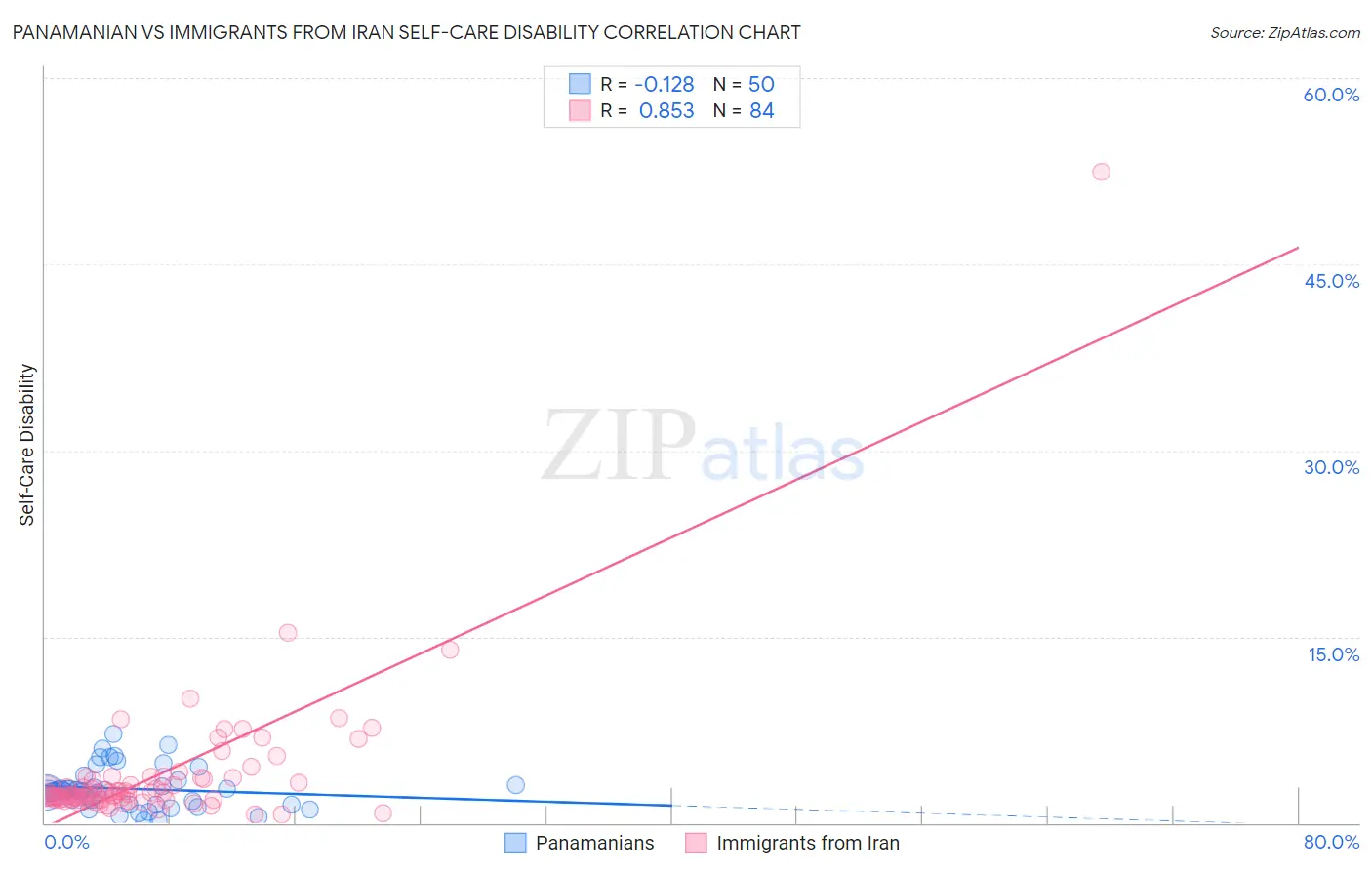 Panamanian vs Immigrants from Iran Self-Care Disability Correlation Chart