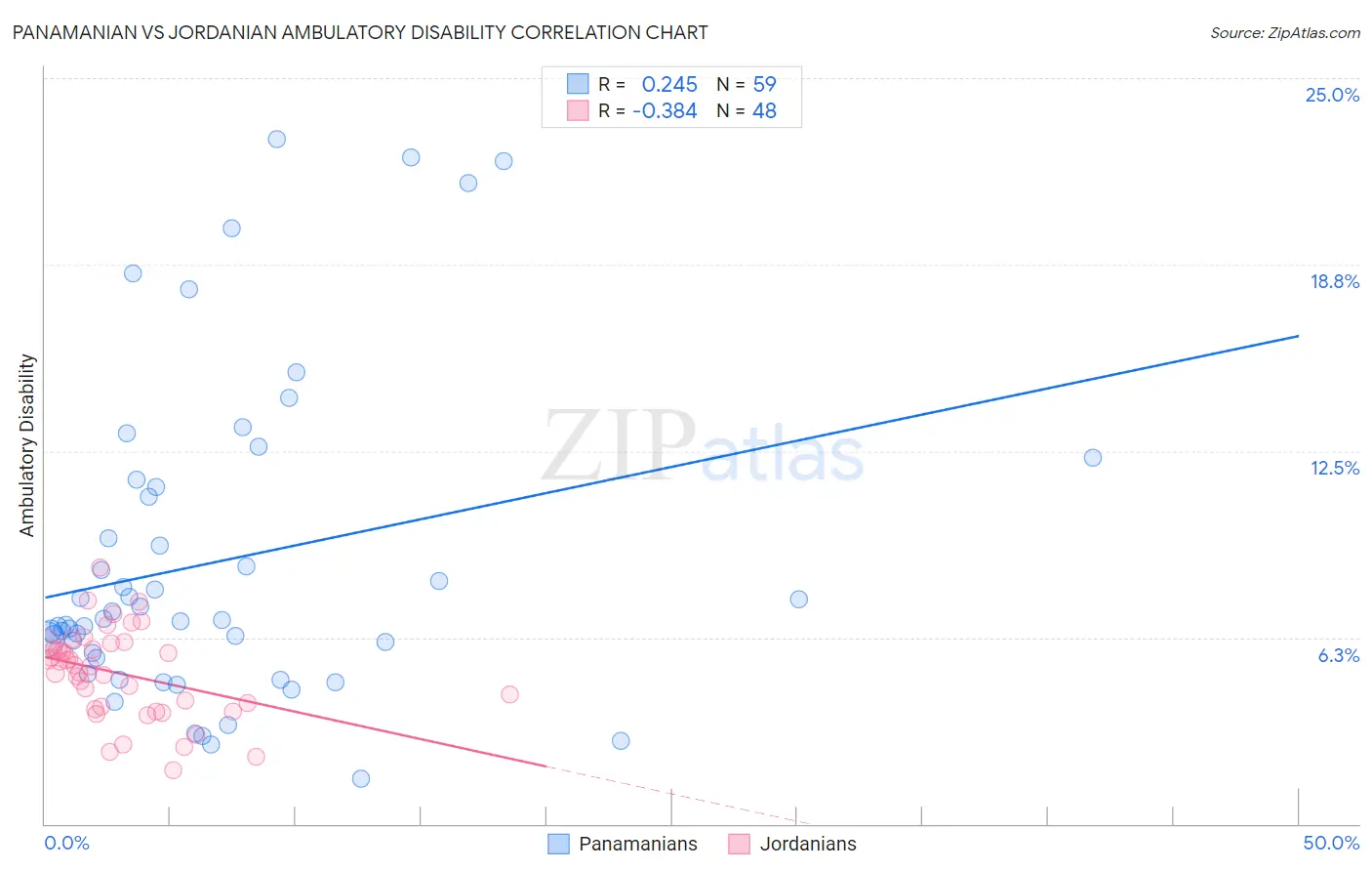 The statistical analysis conducted on geographies consisting of 281,171,683 people shows a weak positive correlation between the proportion of Panamanians and percentage of population with ambulatory disability in the United States with a correlation coefficient (R) of 0.245 and weighted average of 6.4%. Similarly, the statistical analysis conducted on geographies consisting of 166,412,494 people shows a mild negative correlation between the proportion of Jordanians and percentage of population with ambulatory disability in the United States with a correlation coefficient (R) of -0.384 and weighted average of 5.6%, a difference of 14.2%.