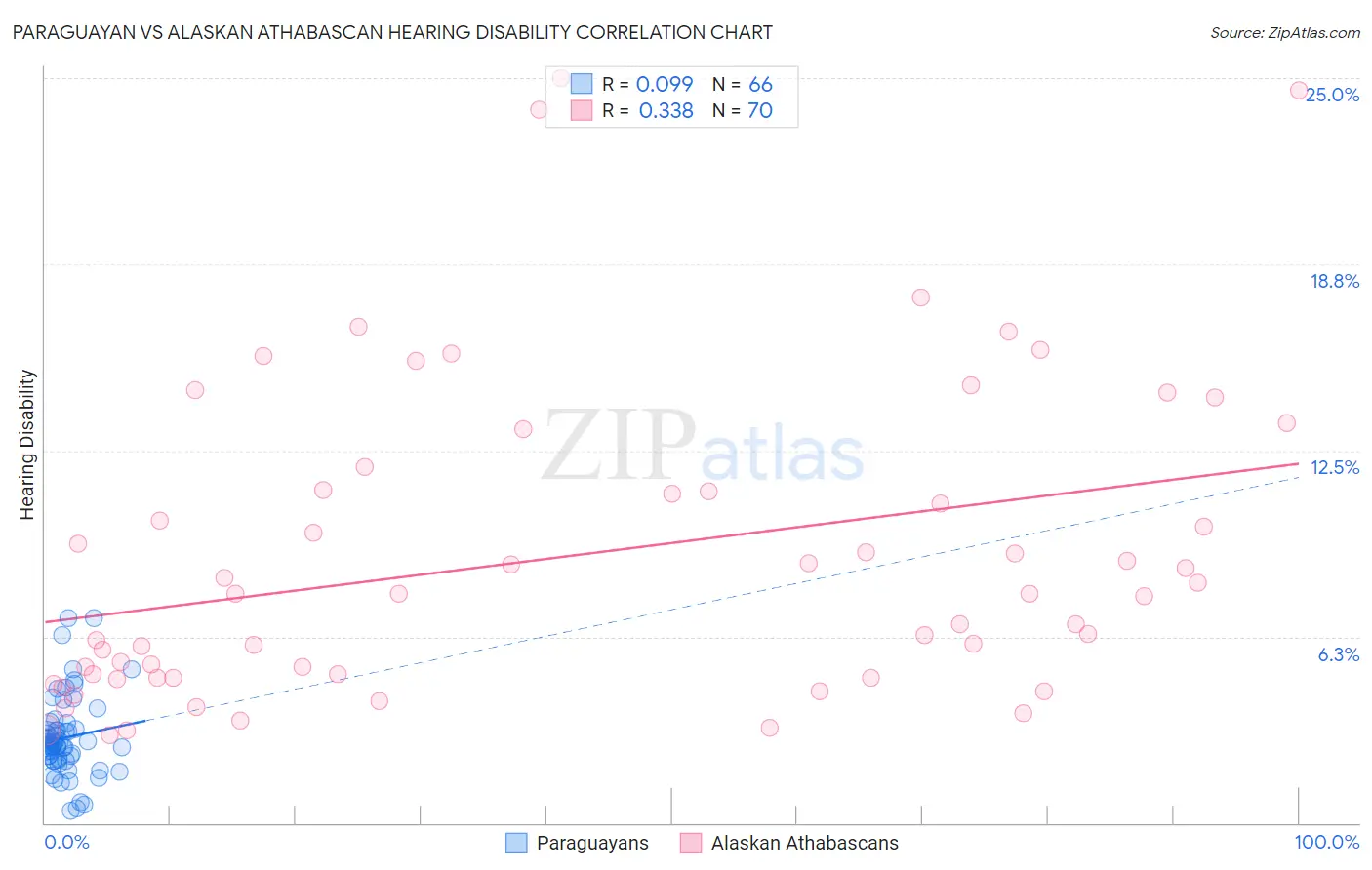 The statistical analysis conducted on geographies consisting of 95,101,593 people shows a slight positive correlation between the proportion of Paraguayans and percentage of population with hearing disability in the United States with a correlation coefficient (R) of 0.099 and weighted average of 2.7%. Similarly, the statistical analysis conducted on geographies consisting of 45,819,269 people shows a mild positive correlation between the proportion of Alaskan Athabascans and percentage of population with hearing disability in the United States with a correlation coefficient (R) of 0.338 and weighted average of 5.3%, a difference of 100.3%.
