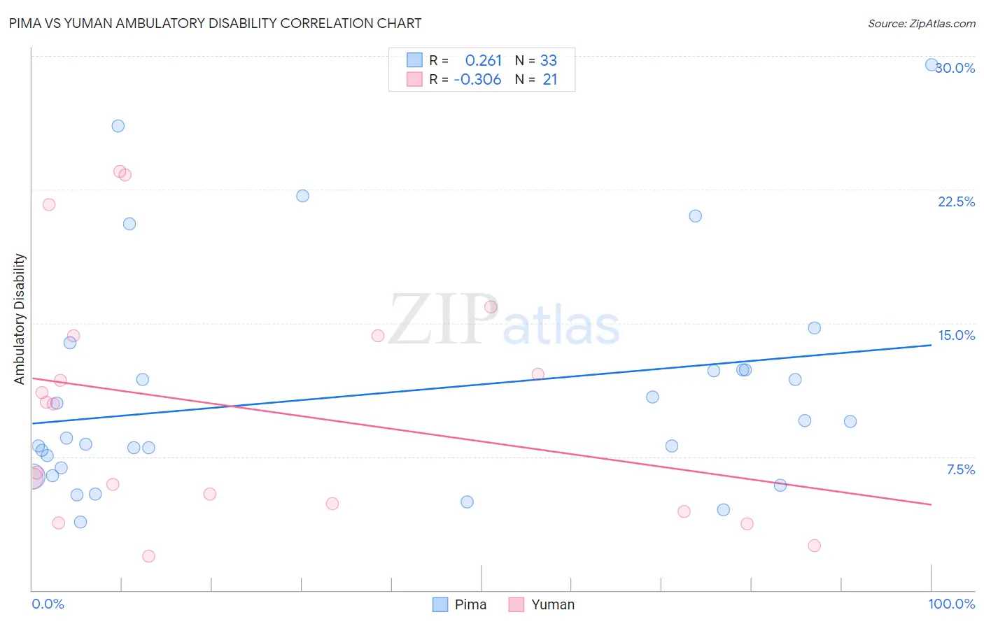 The statistical analysis conducted on geographies consisting of 61,538,415 people shows a weak positive correlation between the proportion of Pima and percentage of population with ambulatory disability in the United States with a correlation coefficient (R) of 0.261 and weighted average of 8.2%. Similarly, the statistical analysis conducted on geographies consisting of 40,645,433 people shows a mild negative correlation between the proportion of Yuman and percentage of population with ambulatory disability in the United States with a correlation coefficient (R) of -0.306 and weighted average of 7.9%, a difference of 3.8%.
