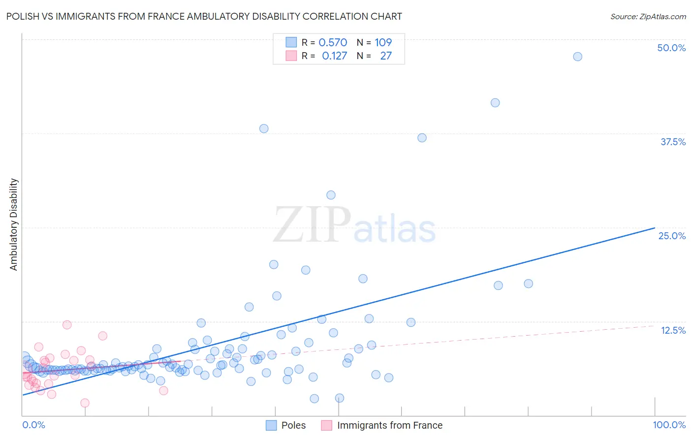 Polish vs Immigrants from France Ambulatory Disability Correlation Chart