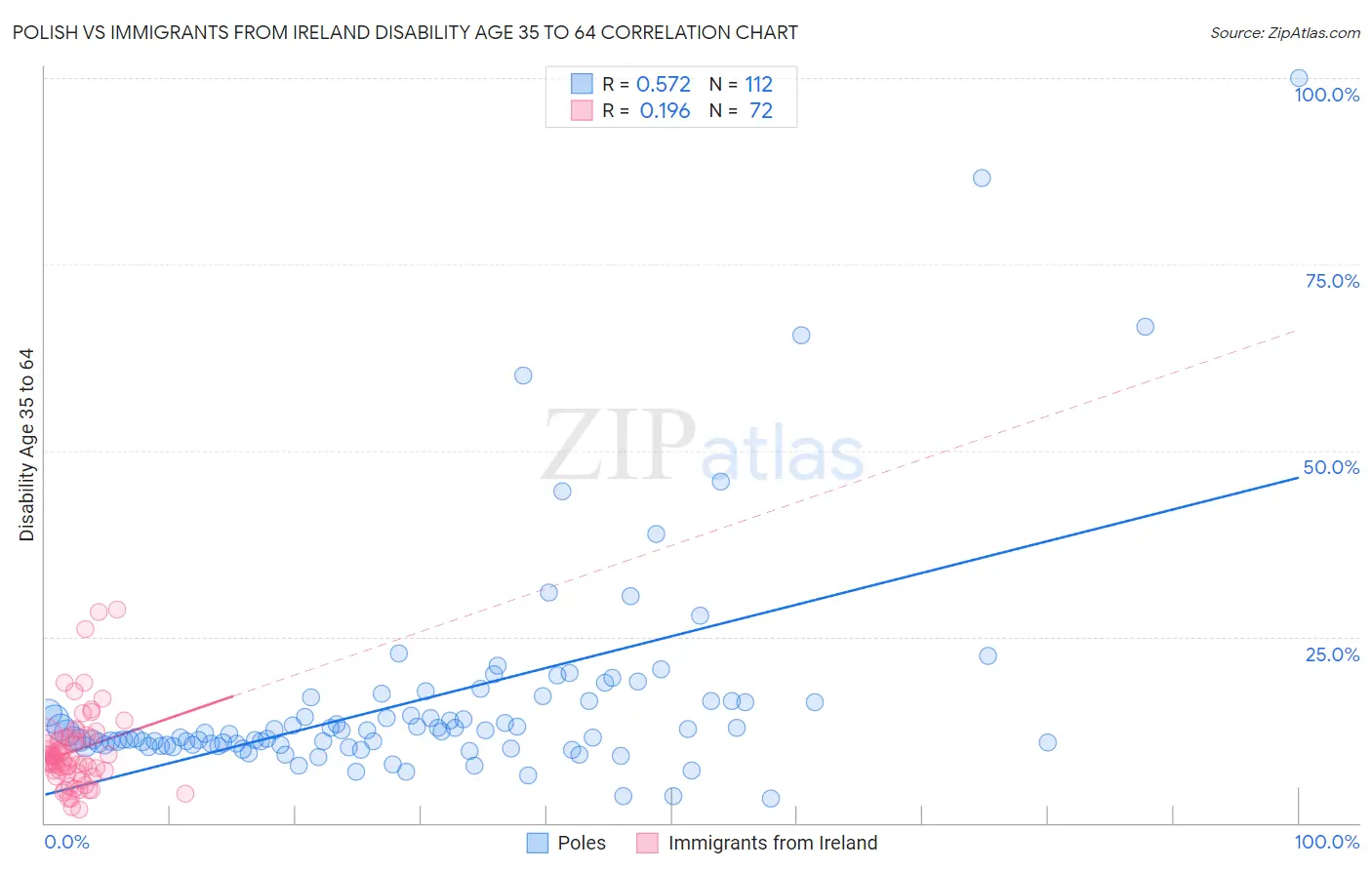 Polish vs Immigrants from Ireland Disability Age 35 to 64 Correlation Chart