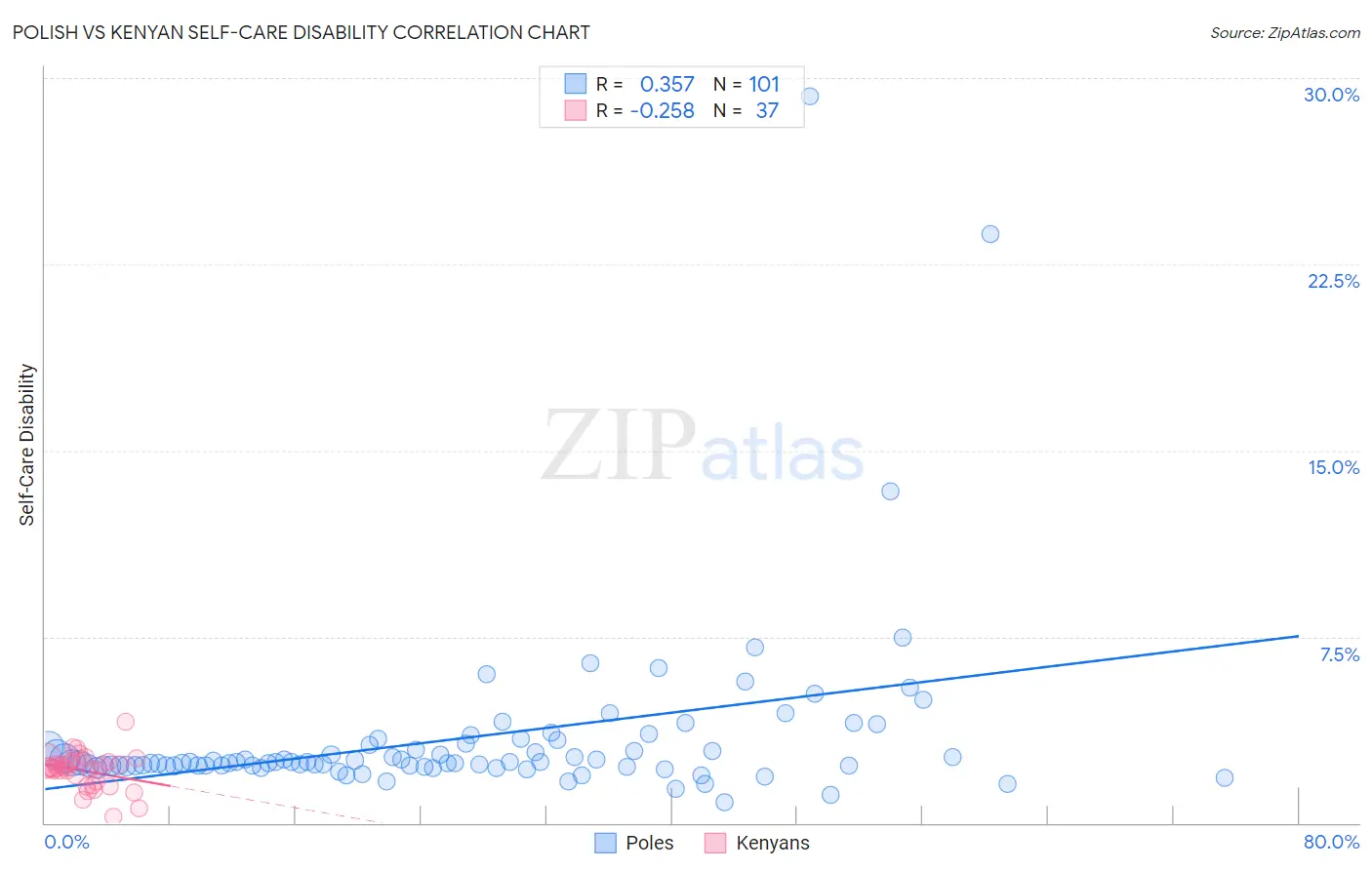 The statistical analysis conducted on geographies consisting of 558,400,698 people shows a mild positive correlation between the proportion of Poles and percentage of population with self-care disability in the United States with a correlation coefficient (R) of 0.357 and weighted average of 2.4%. Similarly, the statistical analysis conducted on geographies consisting of 168,082,411 people shows a weak negative correlation between the proportion of Kenyans and percentage of population with self-care disability in the United States with a correlation coefficient (R) of -0.258 and weighted average of 2.3%, a difference of 4.6%.