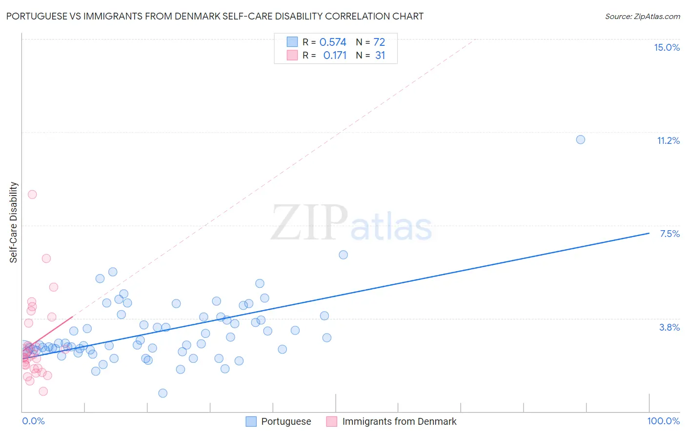 Portuguese vs Immigrants from Denmark Self-Care Disability Correlation Chart