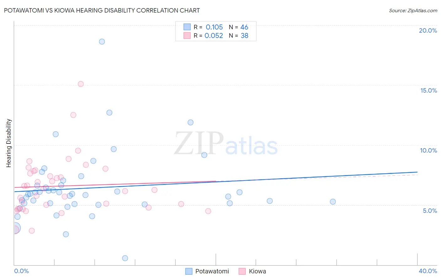 The statistical analysis conducted on geographies consisting of 117,759,395 people shows a poor positive correlation between the proportion of Potawatomi and percentage of population with hearing disability in the United States with a correlation coefficient (R) of 0.105 and weighted average of 4.1%. Similarly, the statistical analysis conducted on geographies consisting of 56,096,605 people shows a slight positive correlation between the proportion of Kiowa and percentage of population with hearing disability in the United States with a correlation coefficient (R) of 0.052 and weighted average of 4.3%, a difference of 5.3%.