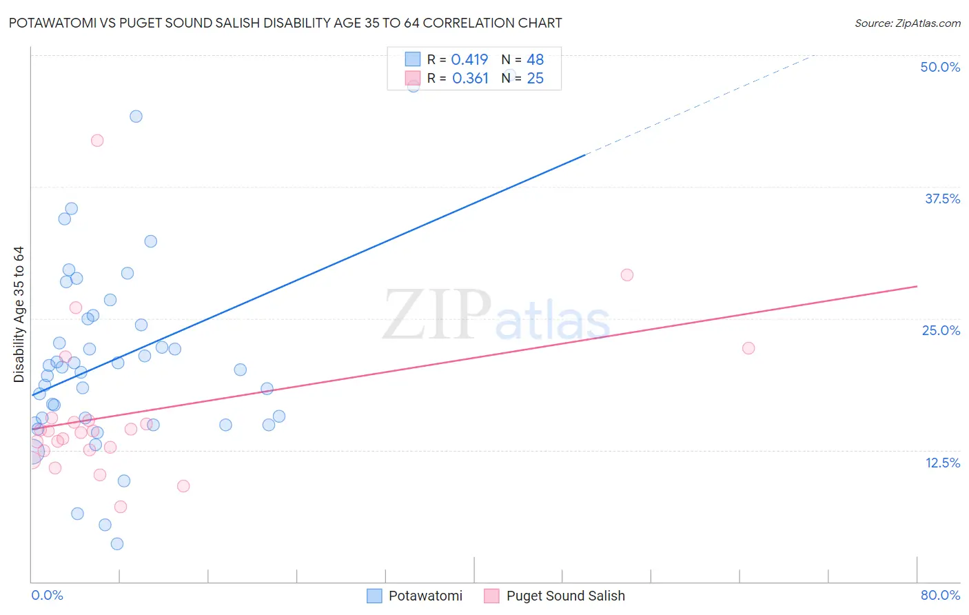 Potawatomi vs Puget Sound Salish Disability Age 35 to 64 Correlation Chart