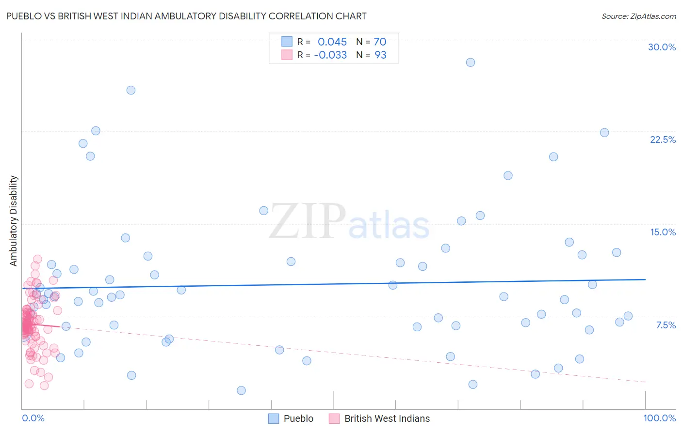The statistical analysis conducted on geographies consisting of 120,067,140 people shows no correlation between the proportion of Pueblo and percentage of population with ambulatory disability in the United States with a correlation coefficient (R) of 0.045 and weighted average of 7.6%. Similarly, the statistical analysis conducted on geographies consisting of 152,684,150 people shows no correlation between the proportion of British West Indians and percentage of population with ambulatory disability in the United States with a correlation coefficient (R) of -0.033 and weighted average of 7.0%, a difference of 9.1%.