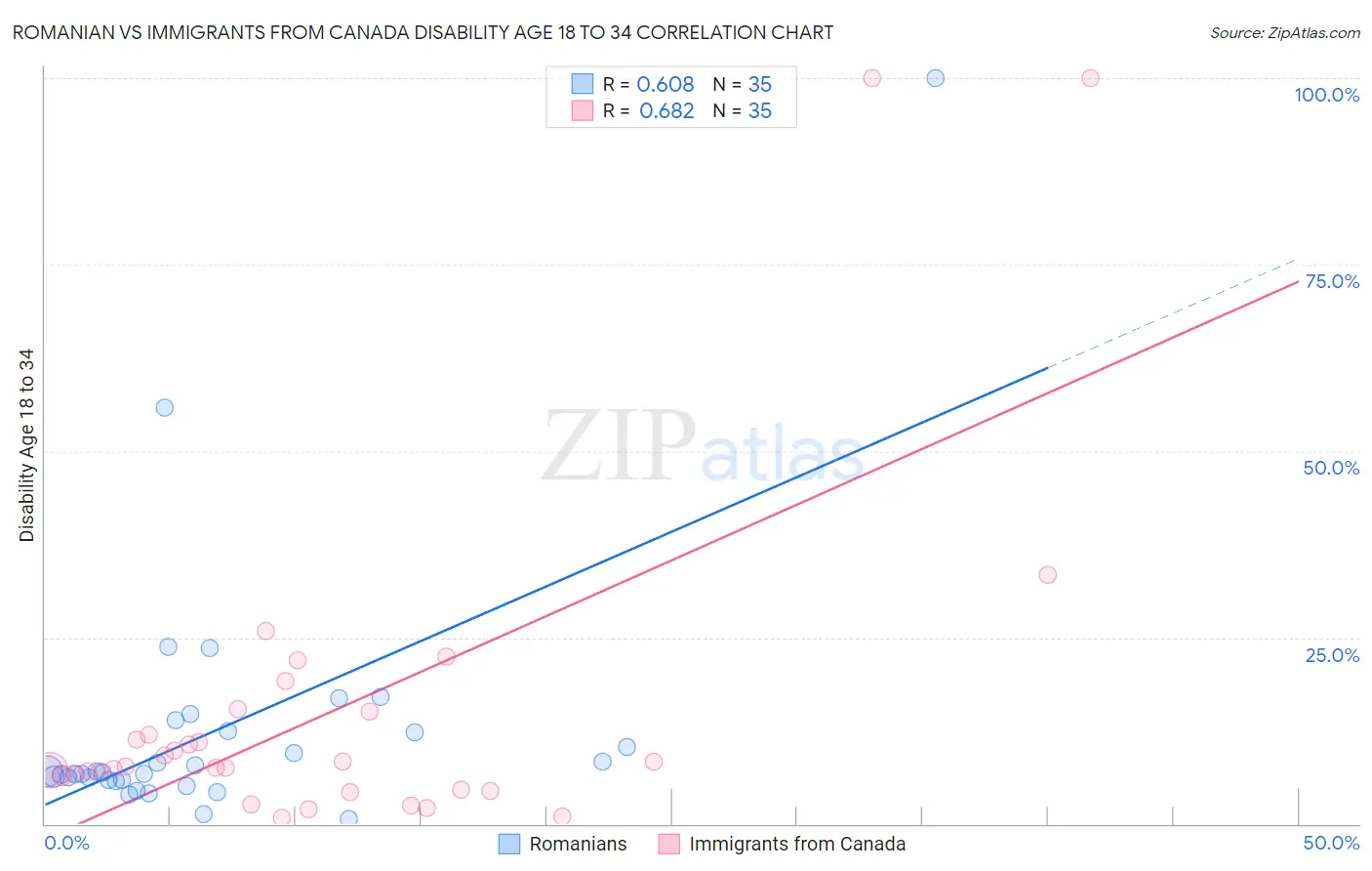 Romanian vs Immigrants from Canada Disability Age 18 to 34 Correlation Chart