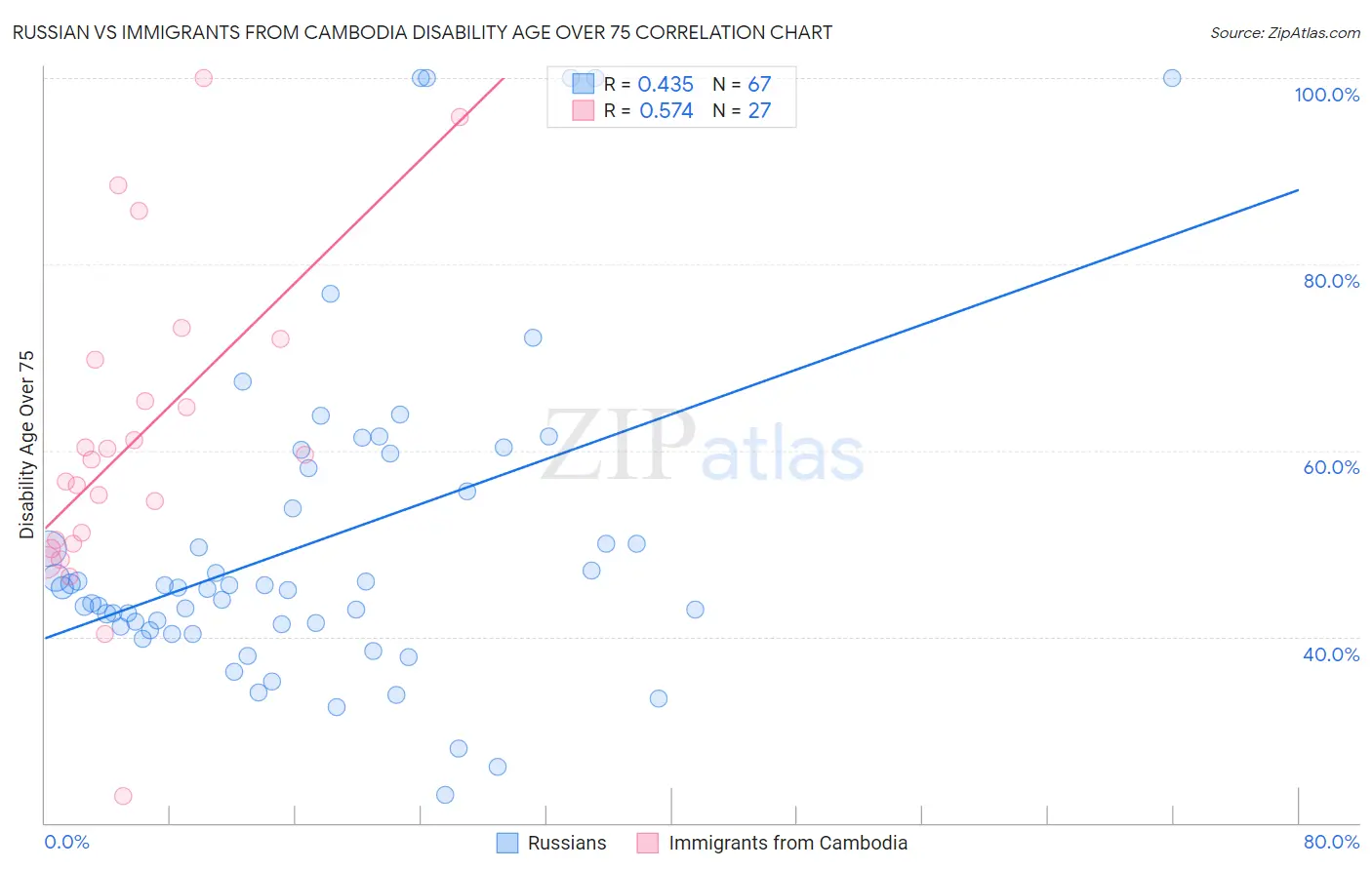 Russian vs Immigrants from Cambodia Disability Age Over 75 Correlation Chart