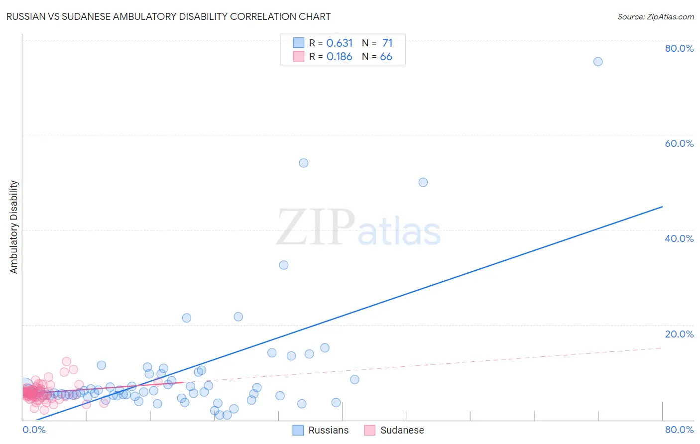 The statistical analysis conducted on geographies consisting of 511,917,360 people shows a significant positive correlation between the proportion of Russians and percentage of population with ambulatory disability in the United States with a correlation coefficient (R) of 0.631 and weighted average of 5.9%. Similarly, the statistical analysis conducted on geographies consisting of 110,129,493 people shows a poor positive correlation between the proportion of Sudanese and percentage of population with ambulatory disability in the United States with a correlation coefficient (R) of 0.186 and weighted average of 5.7%, a difference of 3.4%.