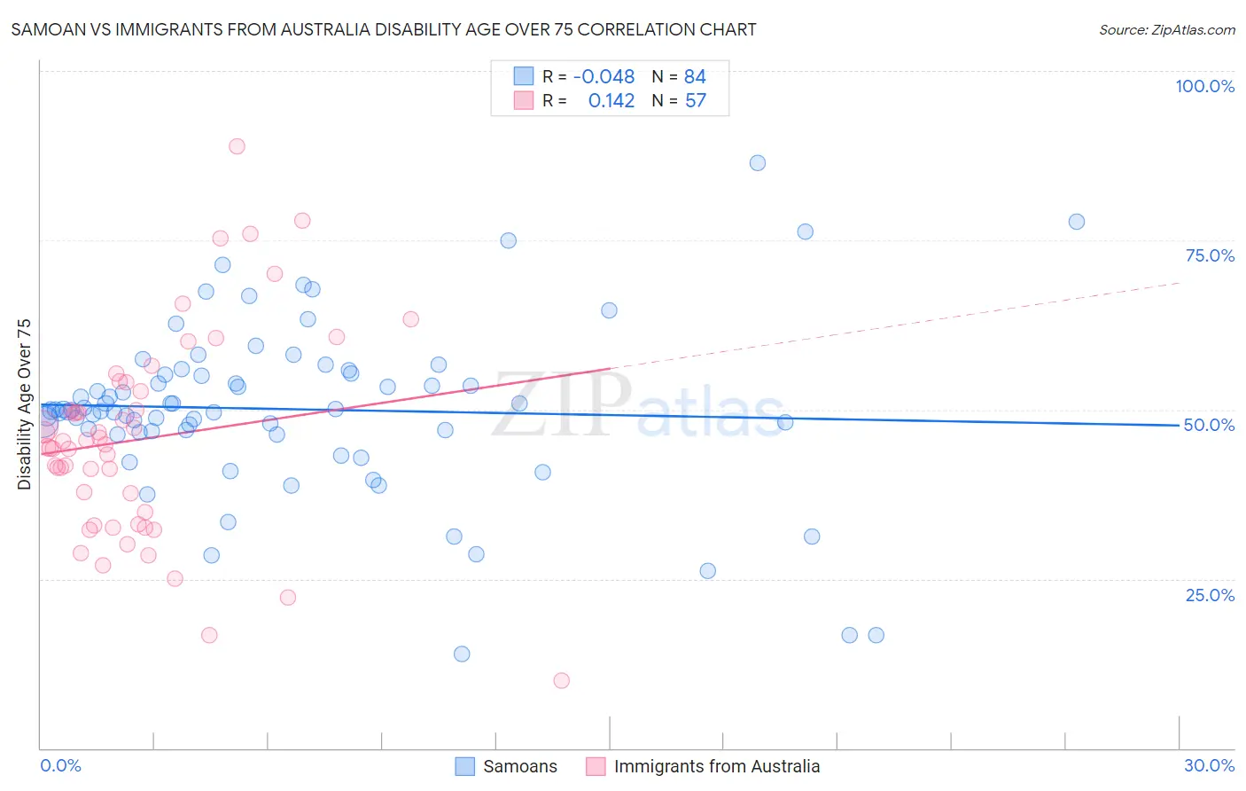 Samoan vs Immigrants from Australia Disability Age Over 75 Correlation Chart