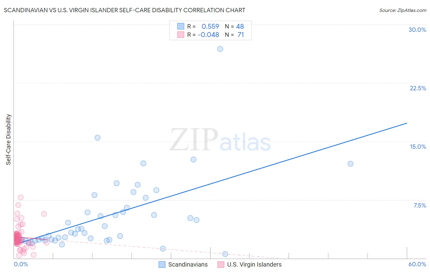 The statistical analysis conducted on geographies consisting of 471,531,720 people shows a substantial positive correlation between the proportion of Scandinavians and percentage of population with self-care disability in the United States with a correlation coefficient (R) of 0.559 and weighted average of 2.4%. Similarly, the statistical analysis conducted on geographies consisting of 87,500,828 people shows no correlation between the proportion of U.S. Virgin Islanders and percentage of population with self-care disability in the United States with a correlation coefficient (R) of -0.048 and weighted average of 2.7%, a difference of 11.7%.