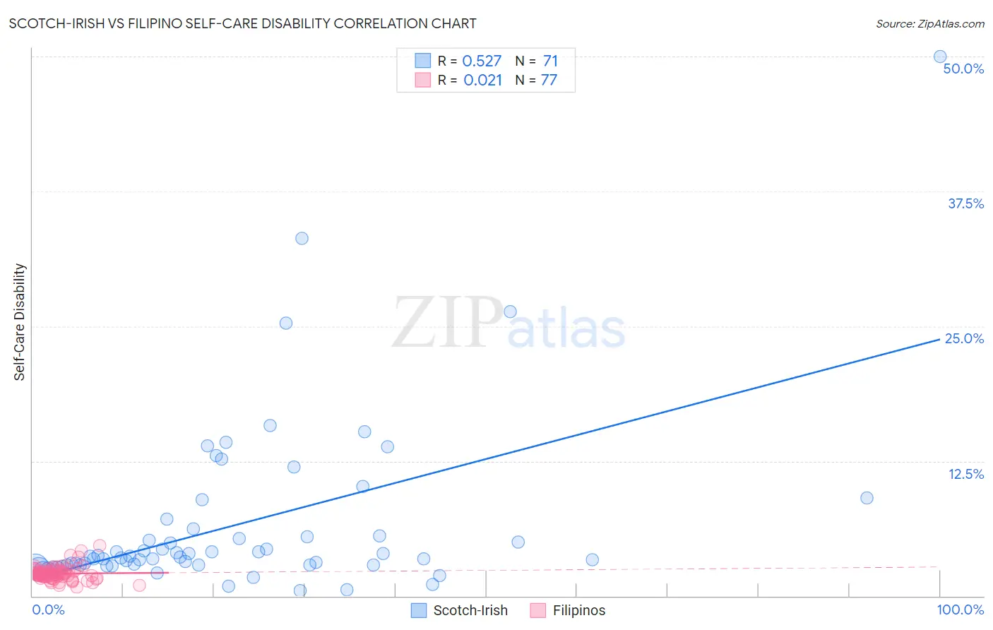 Scotch-Irish vs Filipino Self-Care Disability Correlation Chart