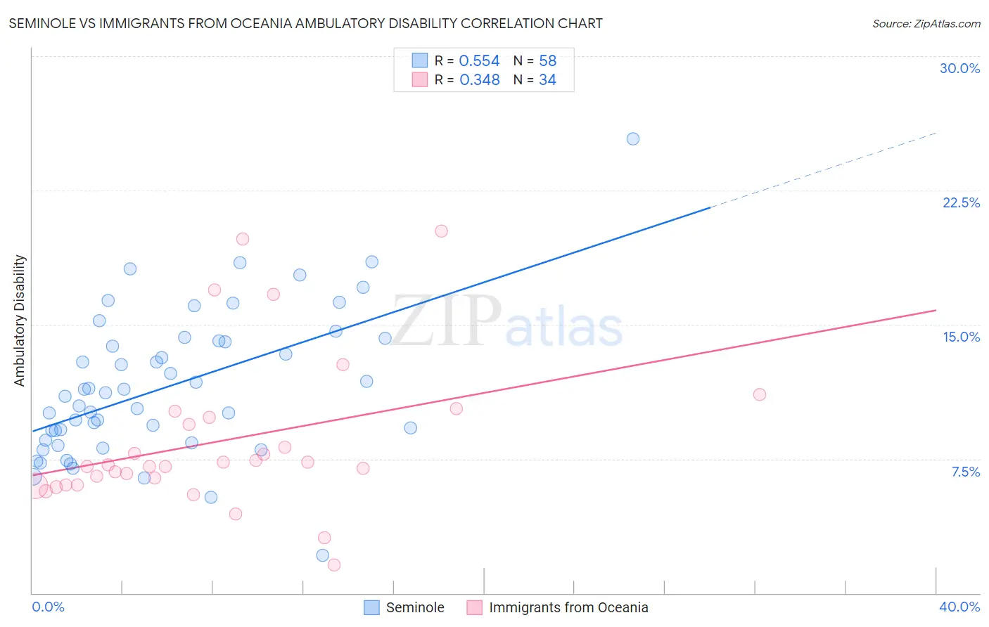 Seminole vs Immigrants from Oceania Ambulatory Disability Correlation Chart