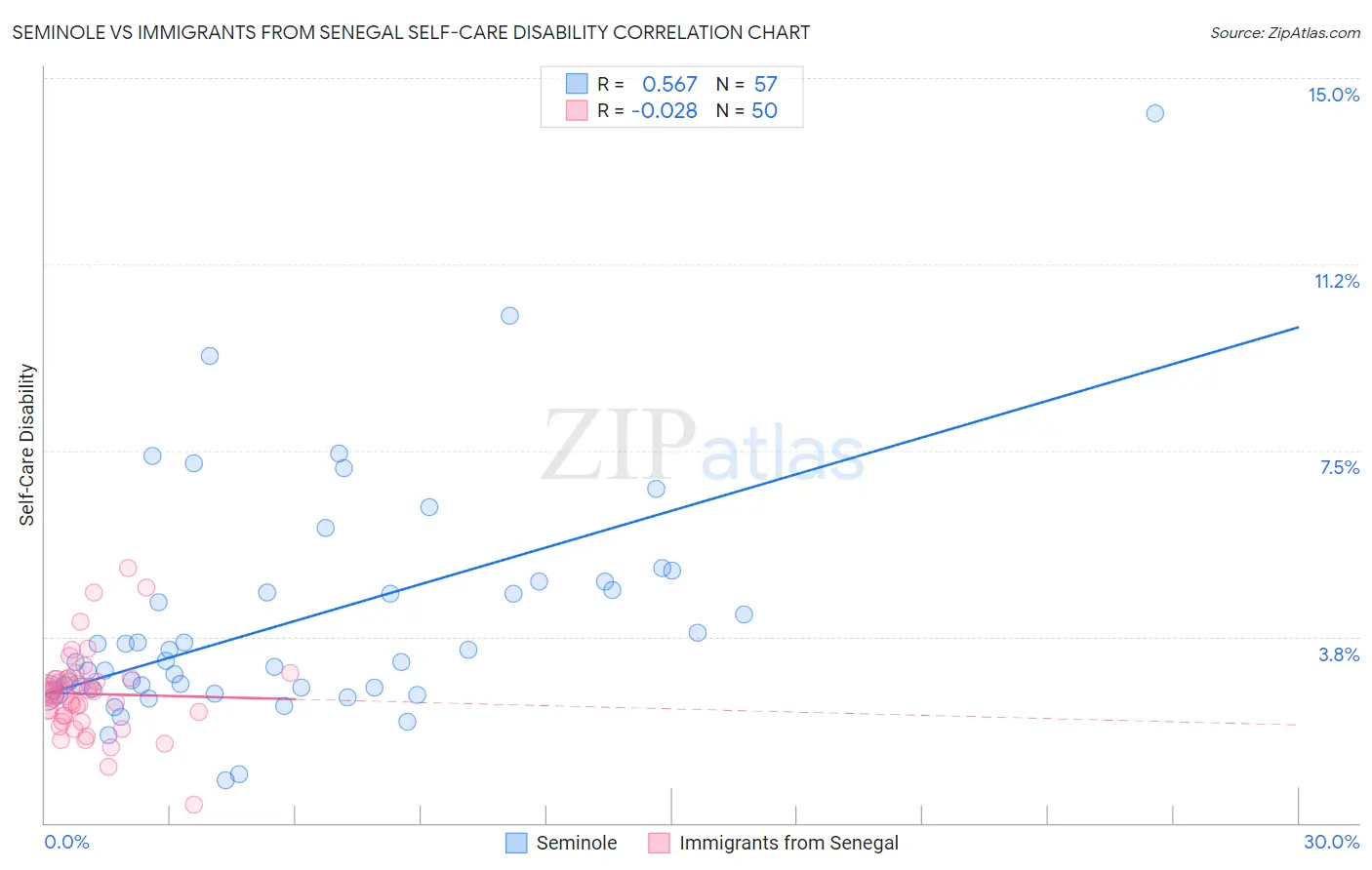 Seminole vs Immigrants from Senegal Self-Care Disability Correlation Chart