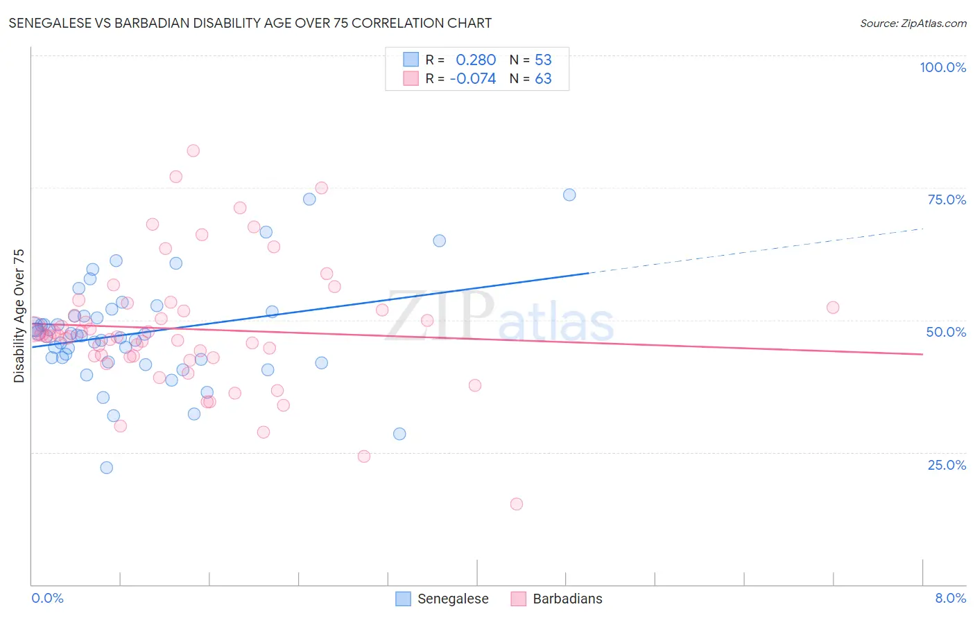 Senegalese vs Barbadian Disability Age Over 75 Correlation Chart