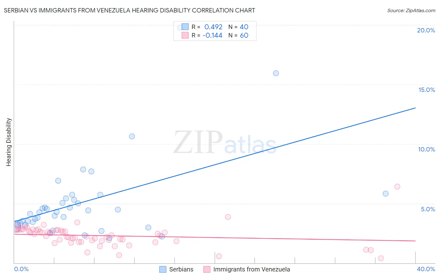Serbian vs Immigrants from Venezuela Hearing Disability Correlation Chart