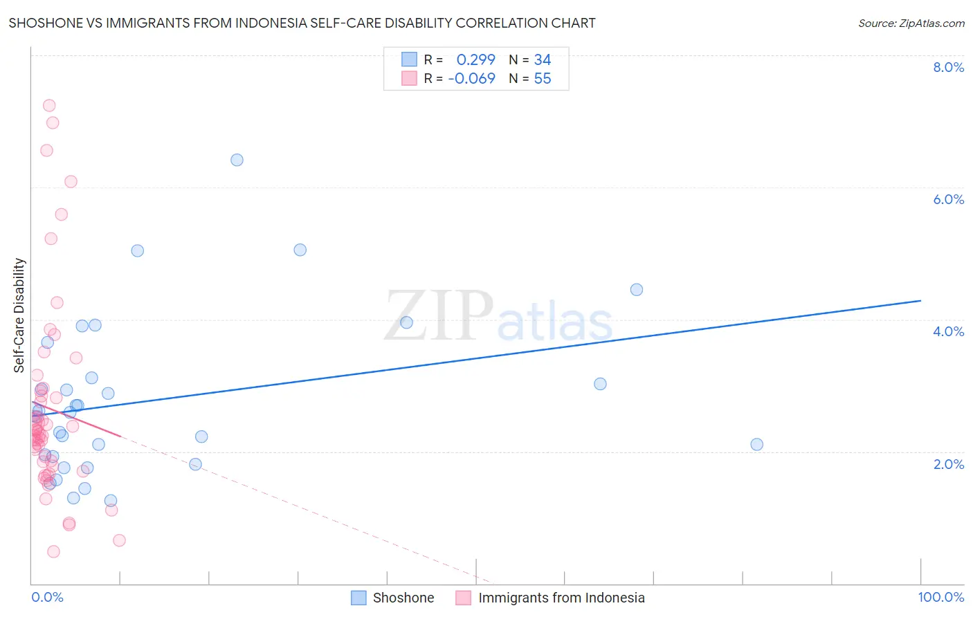 Shoshone vs Immigrants from Indonesia Self-Care Disability Correlation Chart