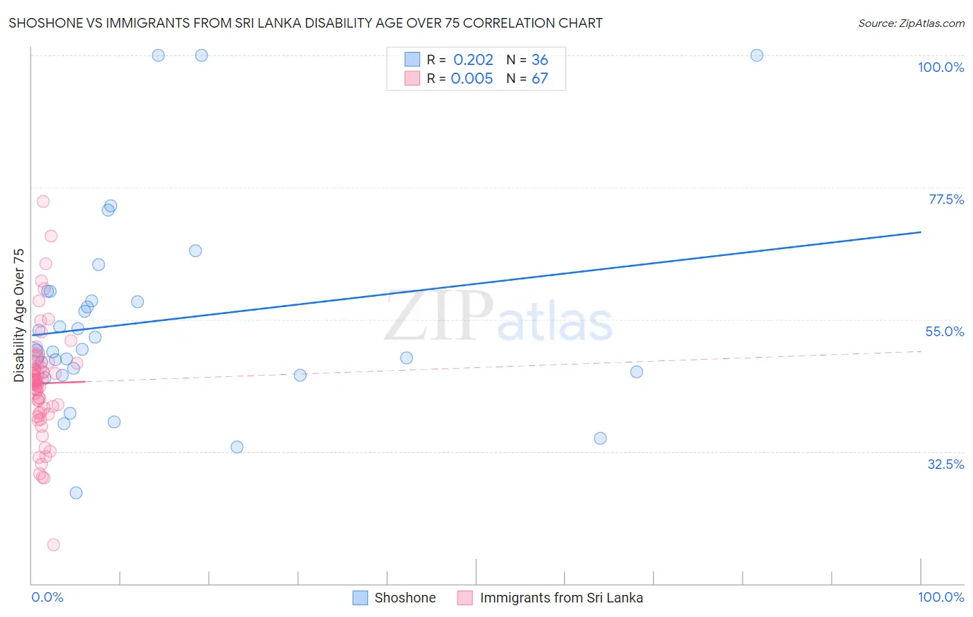 Shoshone vs Immigrants from Sri Lanka Disability Age Over 75 Correlation Chart