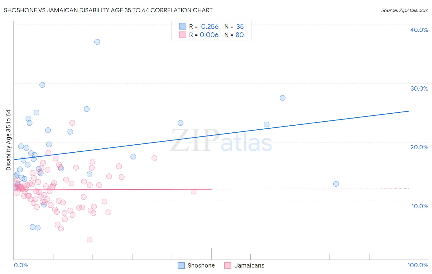 Shoshone vs Jamaican Disability Age 35 to 64 Correlation Chart