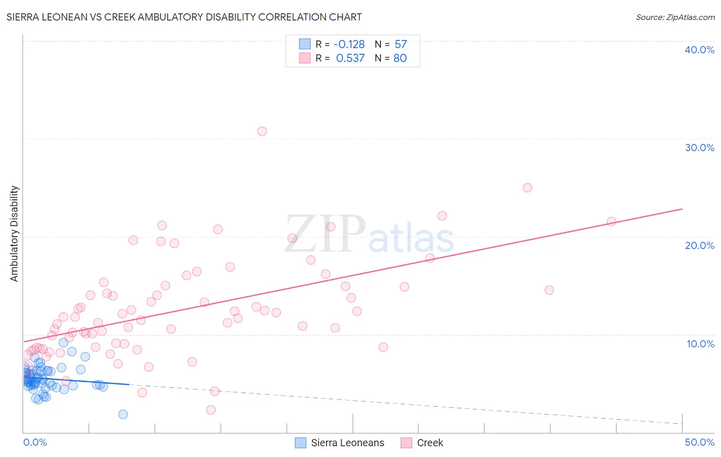 The statistical analysis conducted on geographies consisting of 83,336,135 people shows a poor negative correlation between the proportion of Sierra Leoneans and percentage of population with ambulatory disability in the United States with a correlation coefficient (R) of -0.128 and weighted average of 5.7%. Similarly, the statistical analysis conducted on geographies consisting of 178,444,493 people shows a substantial positive correlation between the proportion of Creek and percentage of population with ambulatory disability in the United States with a correlation coefficient (R) of 0.537 and weighted average of 8.5%, a difference of 48.2%.