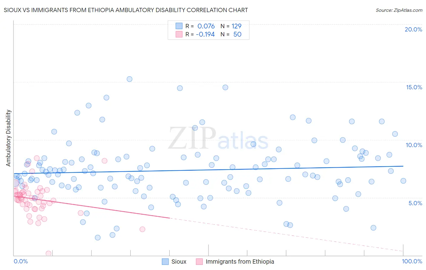 Sioux vs Immigrants from Ethiopia Ambulatory Disability Correlation Chart