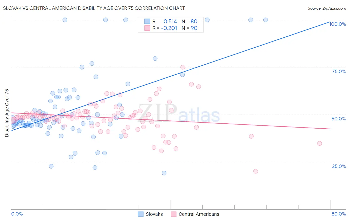 Slovak vs Central American Disability Age Over 75 Correlation Chart