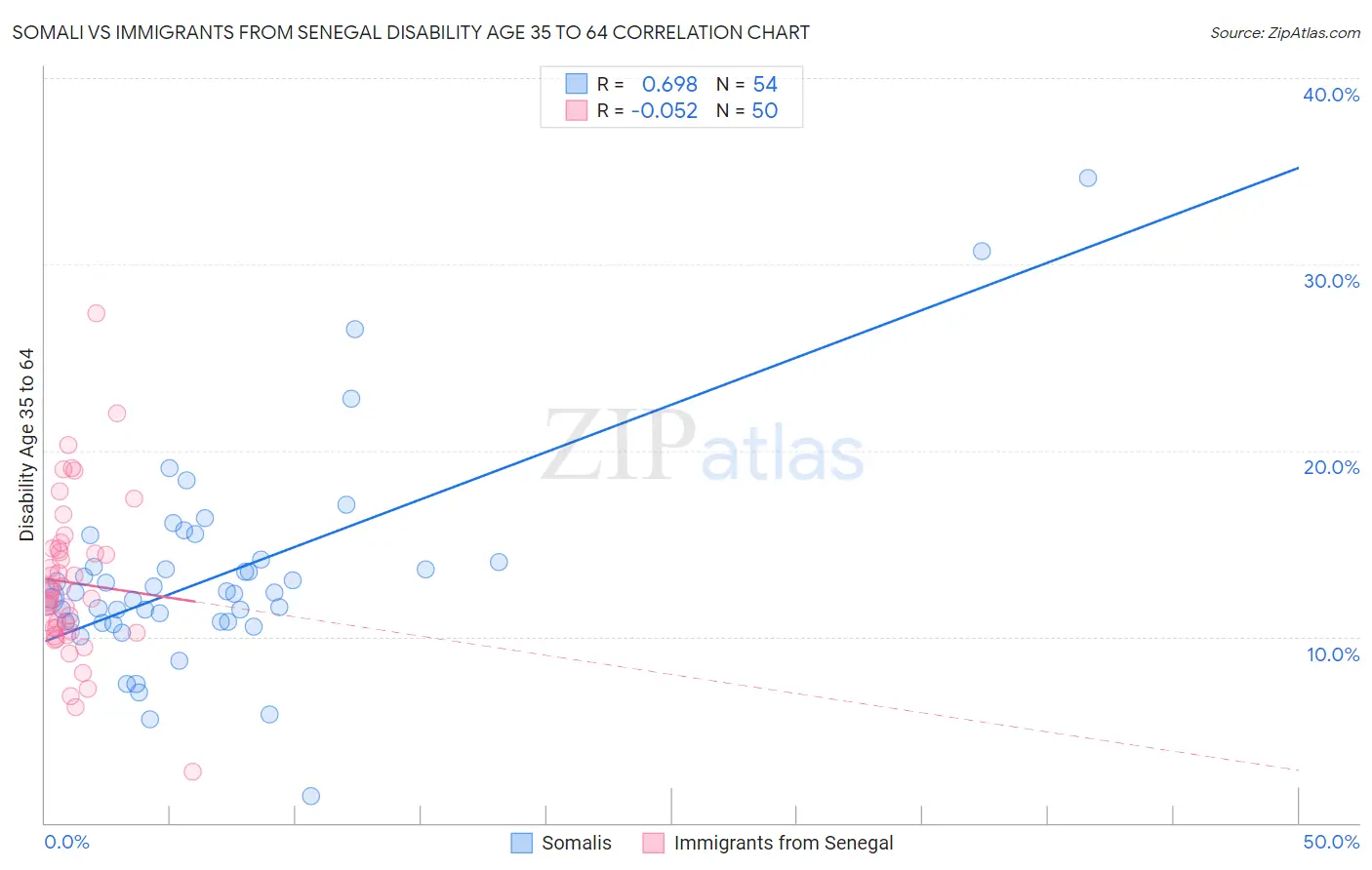Somali vs Immigrants from Senegal Disability Age 35 to 64 Correlation Chart