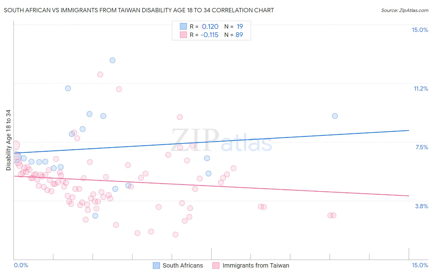 South African vs Immigrants from Taiwan Disability Age 18 to 34 Correlation Chart
