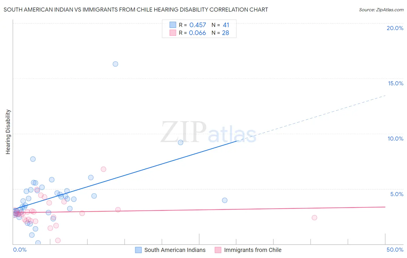South American Indian vs Immigrants from Chile Hearing Disability Correlation Chart