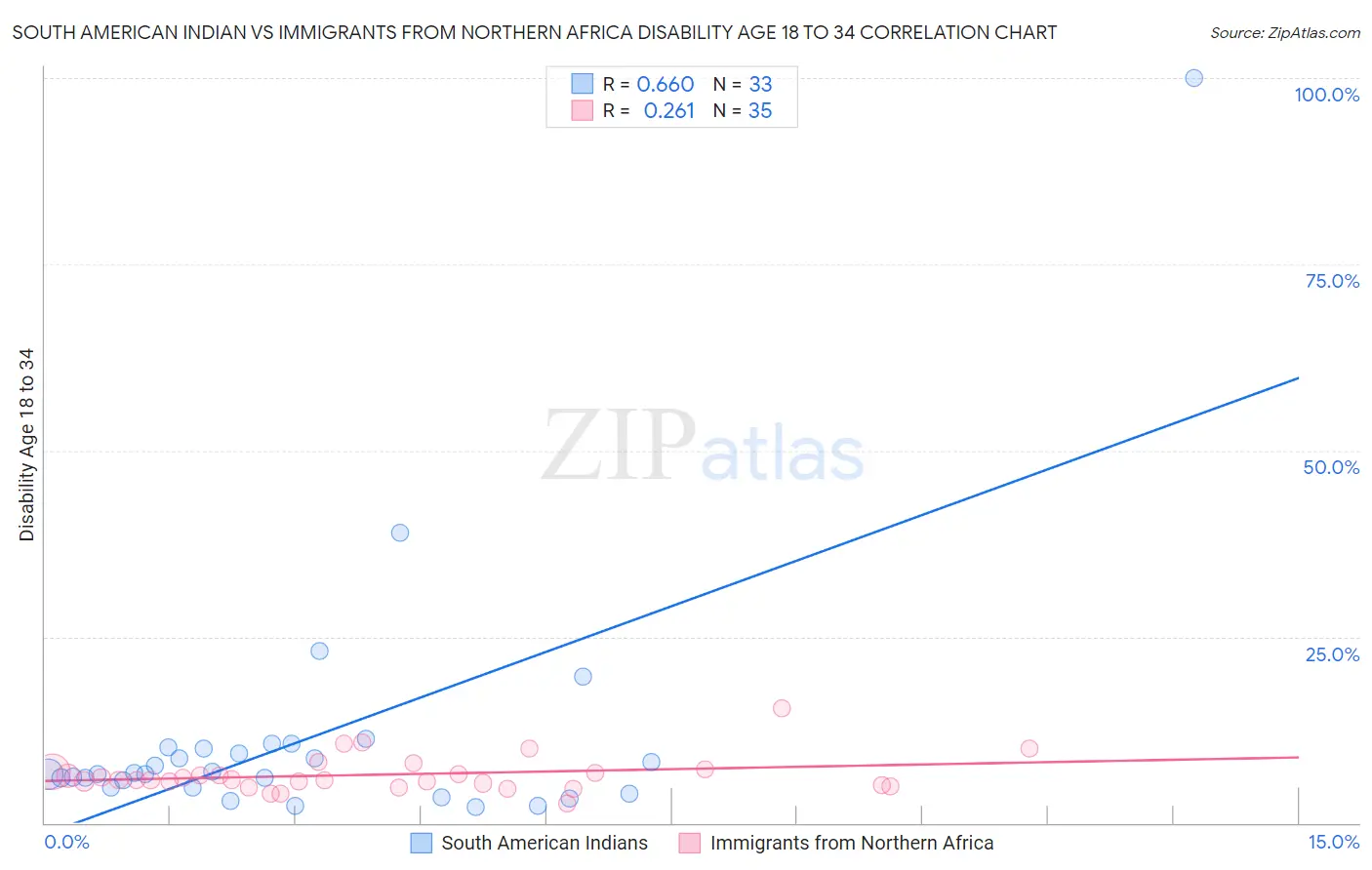 South American Indian vs Immigrants from Northern Africa Disability Age 18 to 34 Correlation Chart
