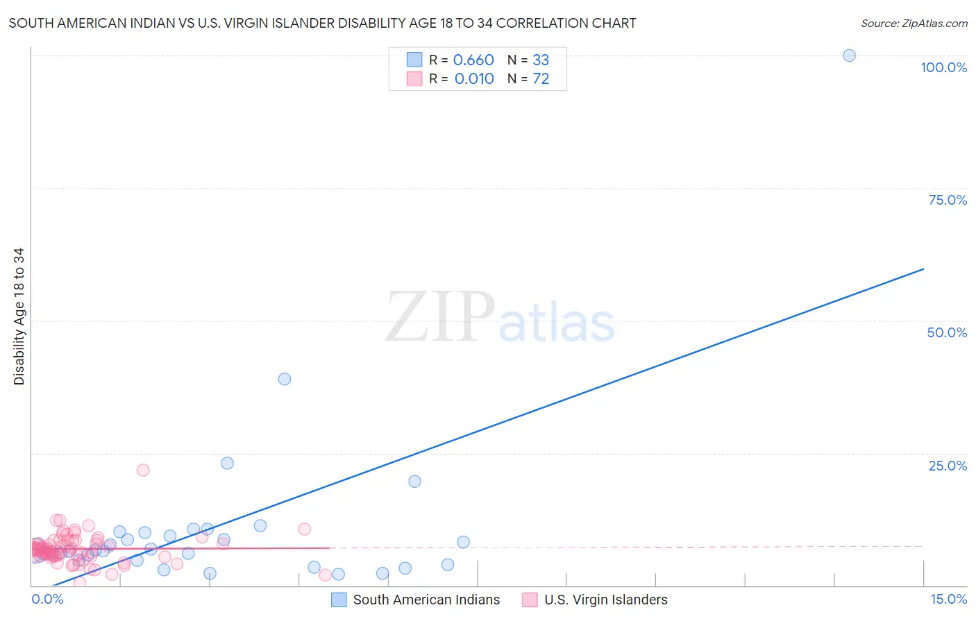 South American Indian vs U.S. Virgin Islander Disability Age 18 to 34 Correlation Chart