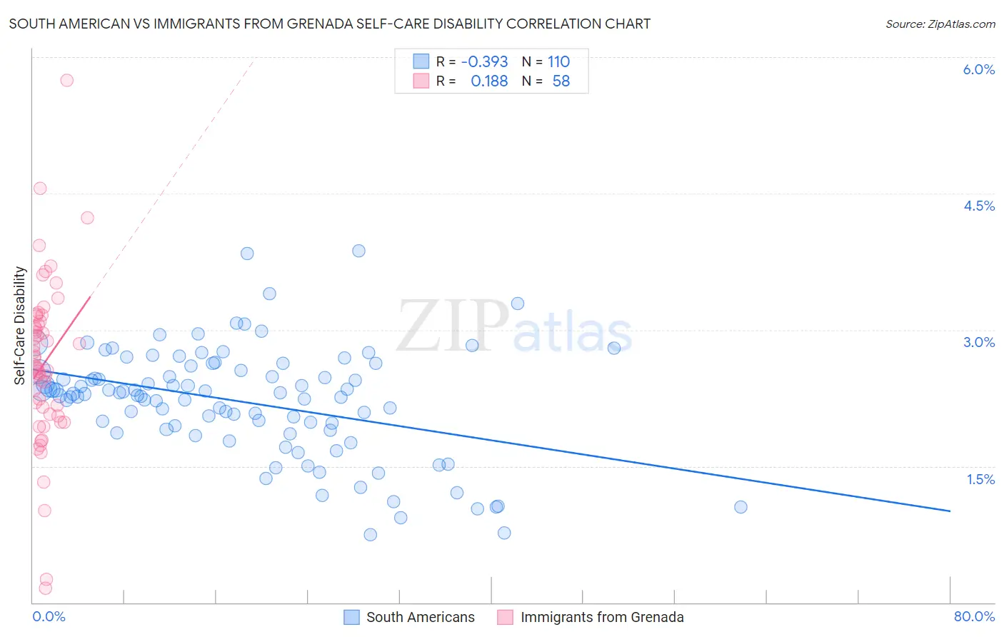 South American vs Immigrants from Grenada Self-Care Disability Correlation Chart