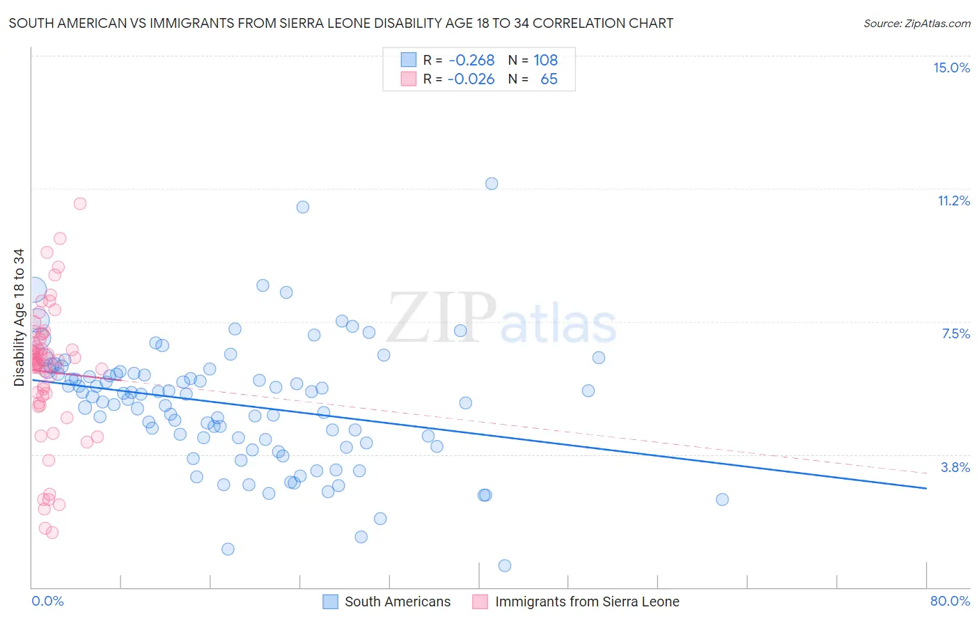South American vs Immigrants from Sierra Leone Disability Age 18 to 34 Correlation Chart