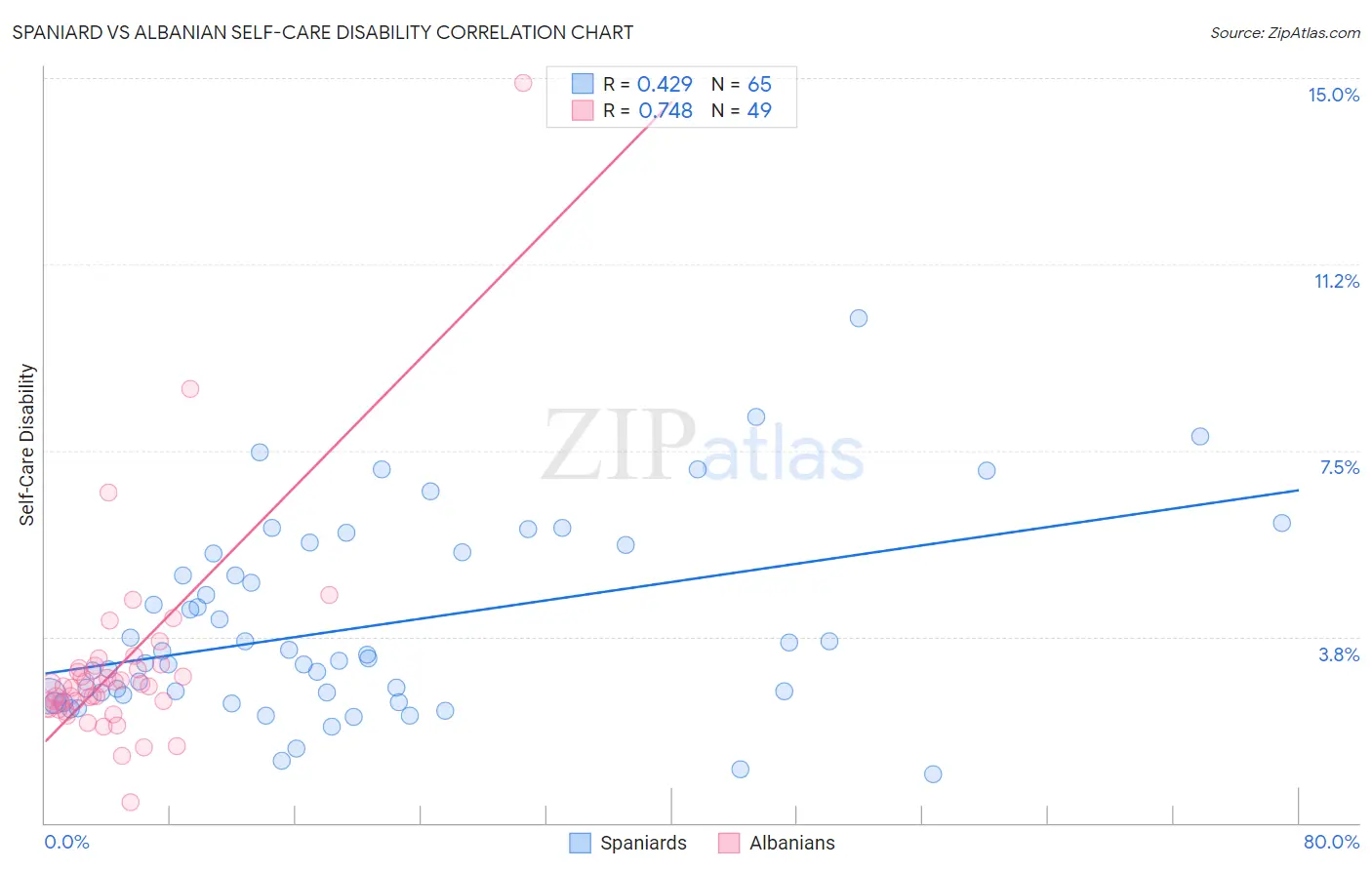 In terms of self-care disability, the demographic groups most similar to Spaniards are French Canadian (2.6%, a difference of 0.0%), Honduran (2.6%, a difference of 0.010%), Subsaharan African (2.6%, a difference of 0.050%), Immigrants from Moldova (2.6%, a difference of 0.060%), and Osage (2.6%, a difference of 0.060%). Similarly, the demographic groups most similar to Albanians are Immigrants from Guatemala (2.6%, a difference of 0.030%), Liberian (2.6%, a difference of 0.040%), Vietnamese (2.6%, a difference of 0.050%), Bahamian (2.6%, a difference of 0.090%), and Bermudan (2.6%, a difference of 0.15%).
