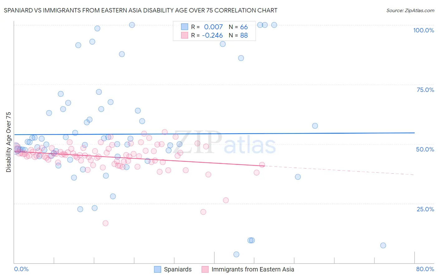 Spaniard vs Immigrants from Eastern Asia Disability Age Over 75 Correlation Chart