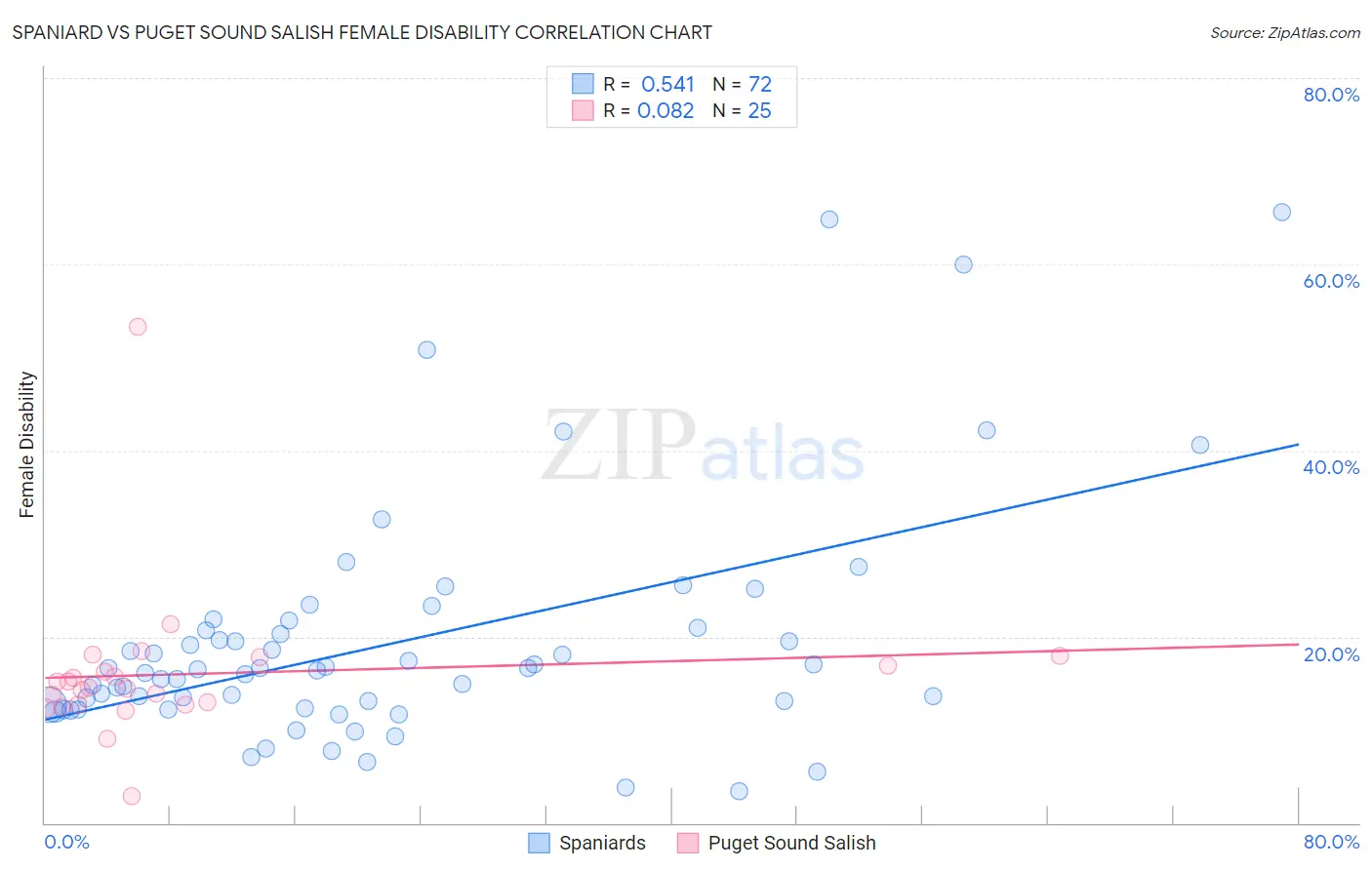 The statistical analysis conducted on geographies consisting of 443,418,073 people shows a substantial positive correlation between the proportion of Spaniards and percentage of females with a disability in the United States with a correlation coefficient (R) of 0.541 and weighted average of 12.8%. Similarly, the statistical analysis conducted on geographies consisting of 46,152,398 people shows a slight positive correlation between the proportion of Puget Sound Salish and percentage of females with a disability in the United States with a correlation coefficient (R) of 0.082 and weighted average of 13.8%, a difference of 8.5%.