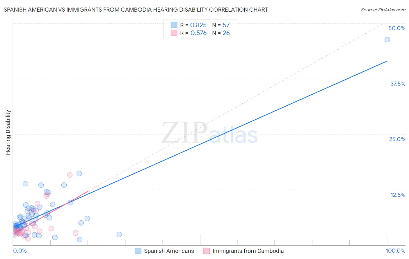 Spanish American vs Immigrants from Cambodia Hearing Disability Correlation Chart