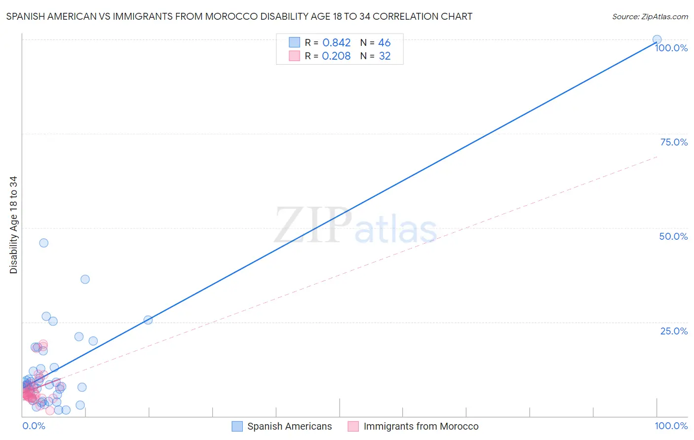 Spanish American vs Immigrants from Morocco Disability Age 18 to 34 Correlation Chart