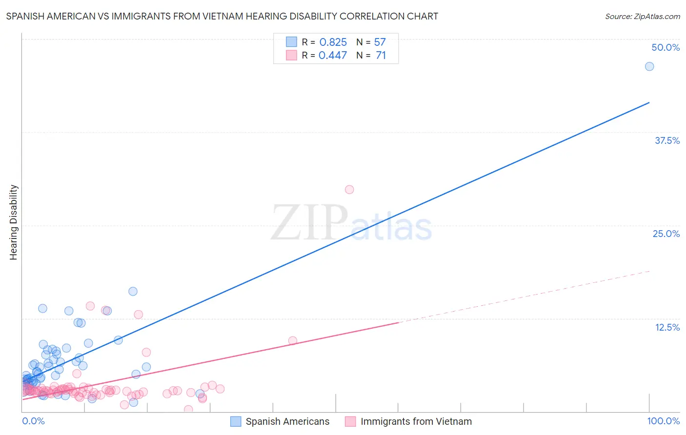 Spanish American vs Immigrants from Vietnam Hearing Disability Correlation Chart