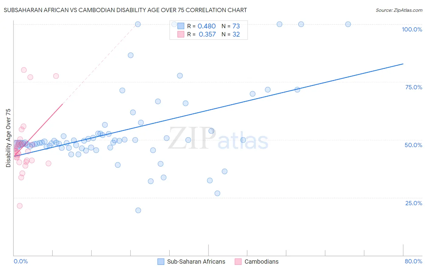 Subsaharan African vs Cambodian Disability Age Over 75 Correlation Chart