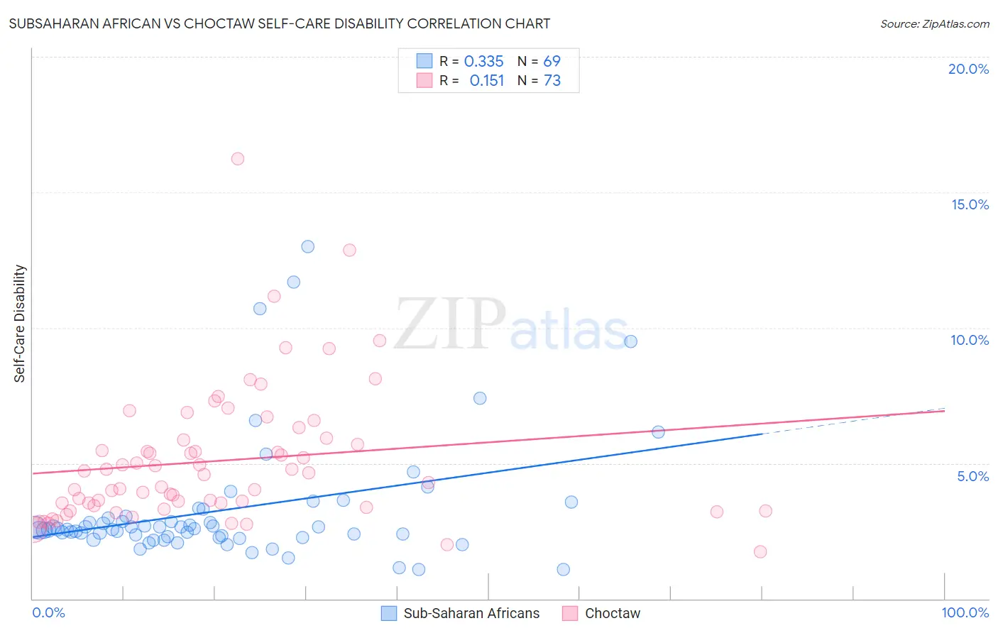 Subsaharan African vs Choctaw Self-Care Disability Correlation Chart