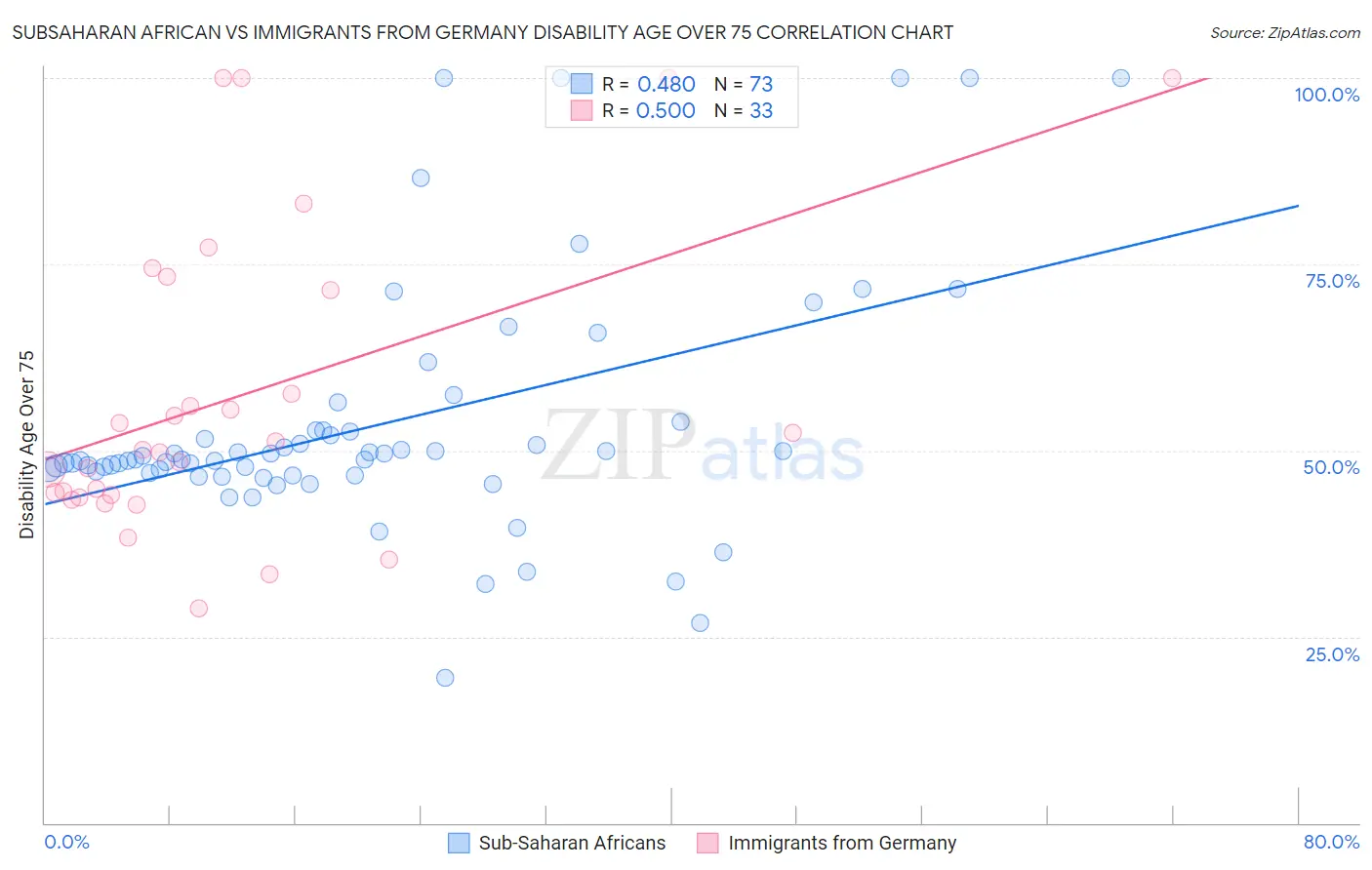 Subsaharan African vs Immigrants from Germany Disability Age Over 75 Correlation Chart