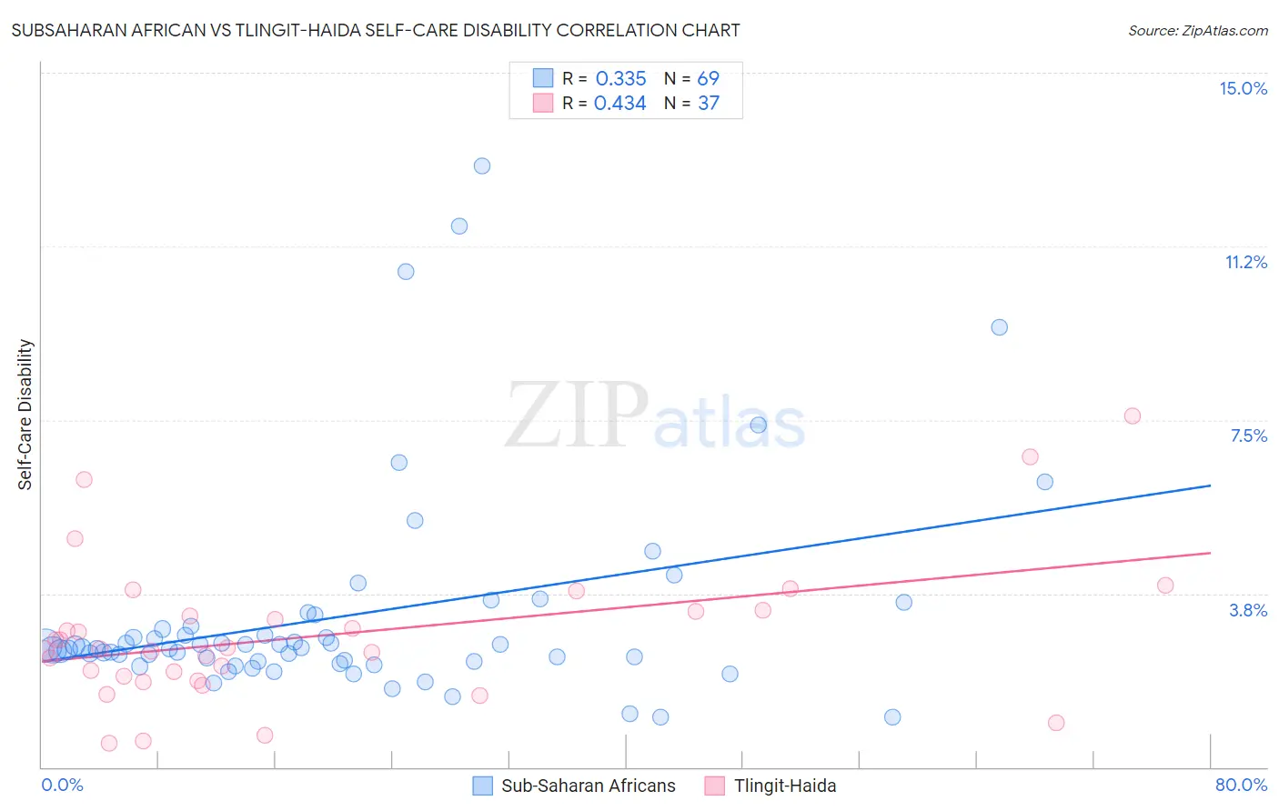 Subsaharan African vs Tlingit-Haida Self-Care Disability Correlation Chart
