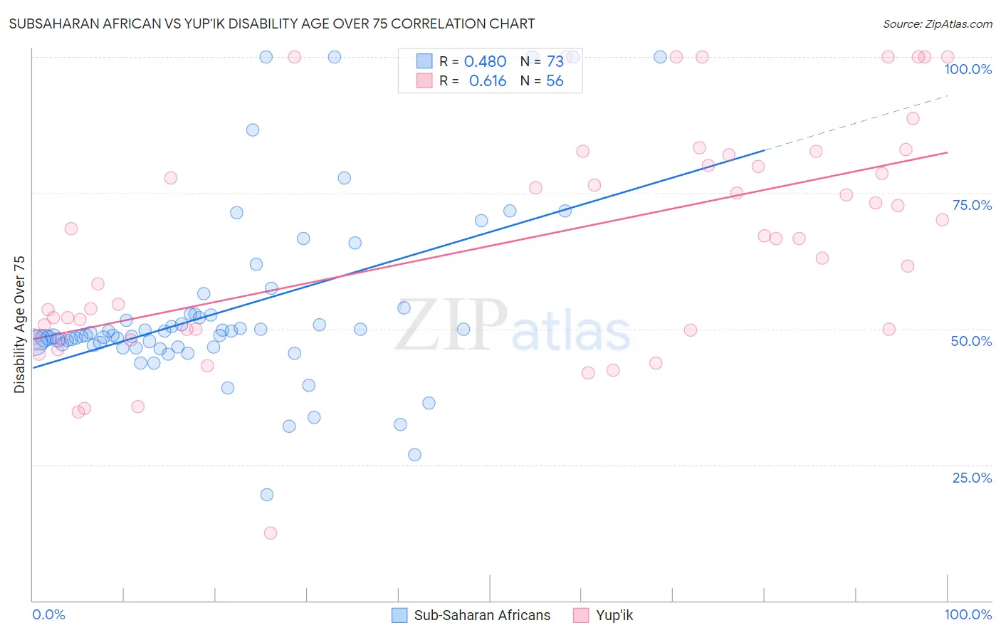 Subsaharan African vs Yup'ik Disability Age Over 75 Correlation Chart