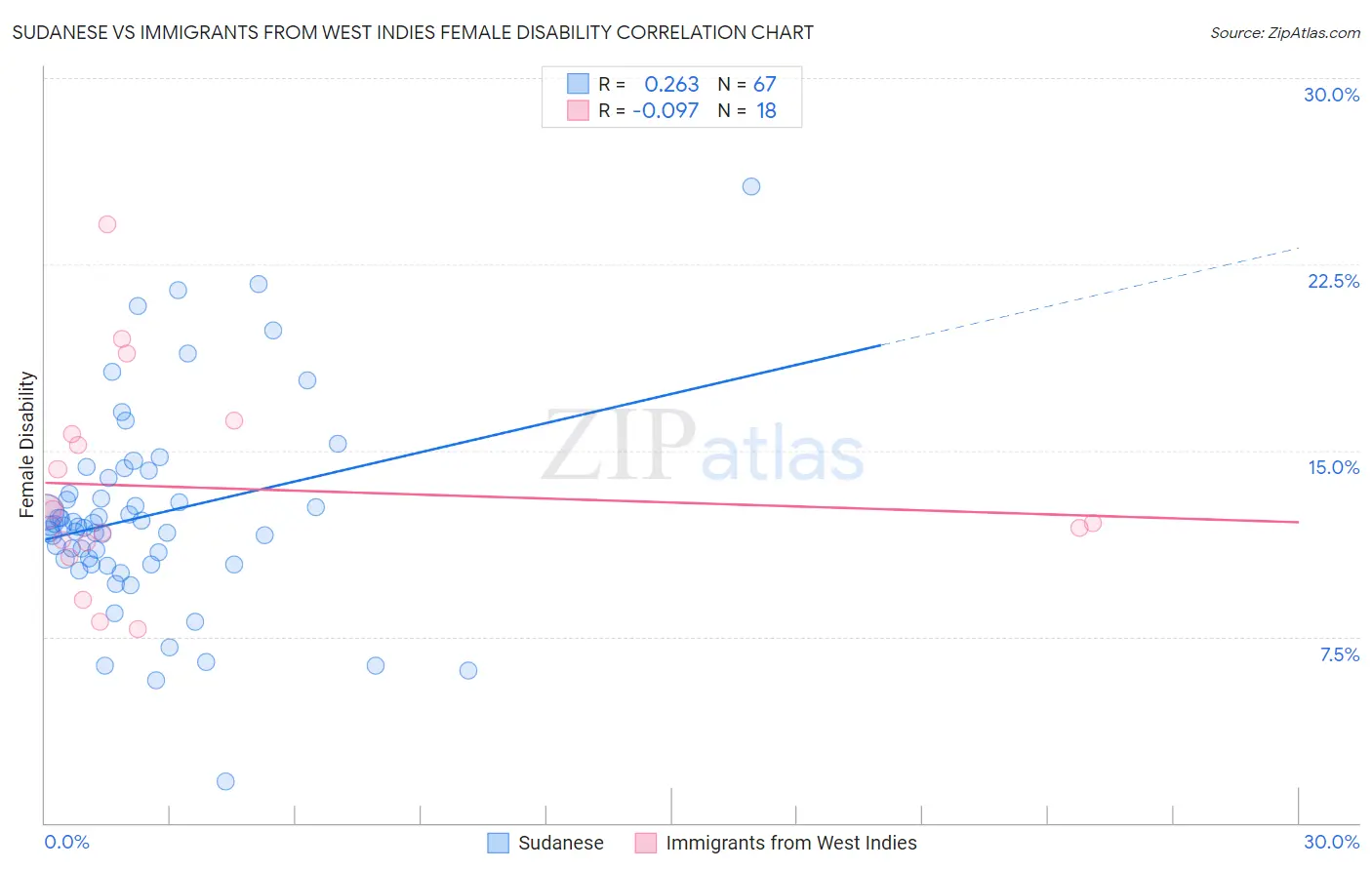 Sudanese vs Immigrants from West Indies Female Disability Correlation Chart