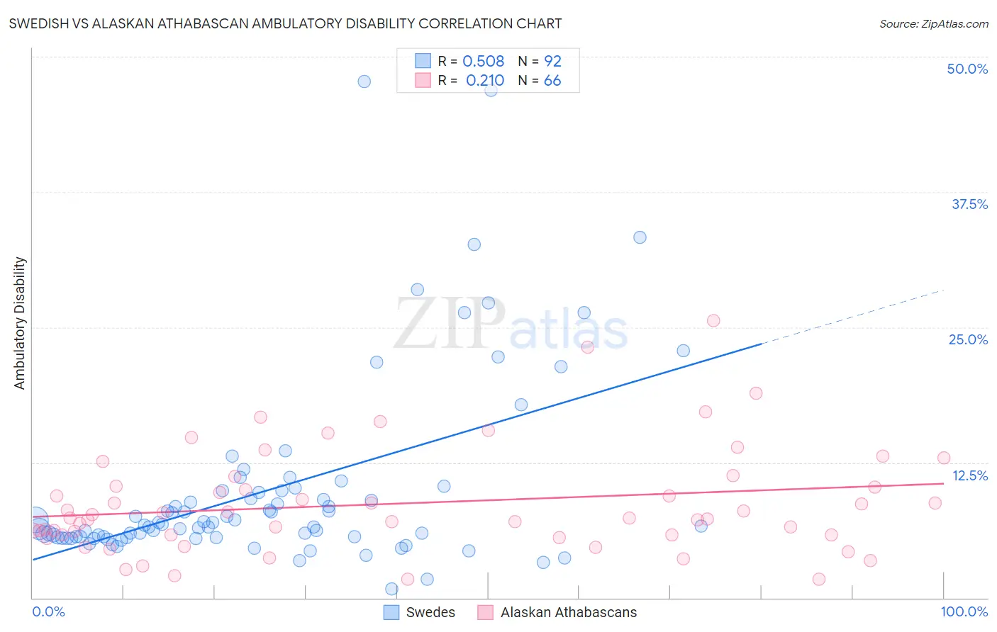The statistical analysis conducted on geographies consisting of 538,852,545 people shows a substantial positive correlation between the proportion of Swedes and percentage of population with ambulatory disability in the United States with a correlation coefficient (R) of 0.508 and weighted average of 6.0%. Similarly, the statistical analysis conducted on geographies consisting of 45,819,153 people shows a weak positive correlation between the proportion of Alaskan Athabascans and percentage of population with ambulatory disability in the United States with a correlation coefficient (R) of 0.210 and weighted average of 6.9%, a difference of 15.6%.