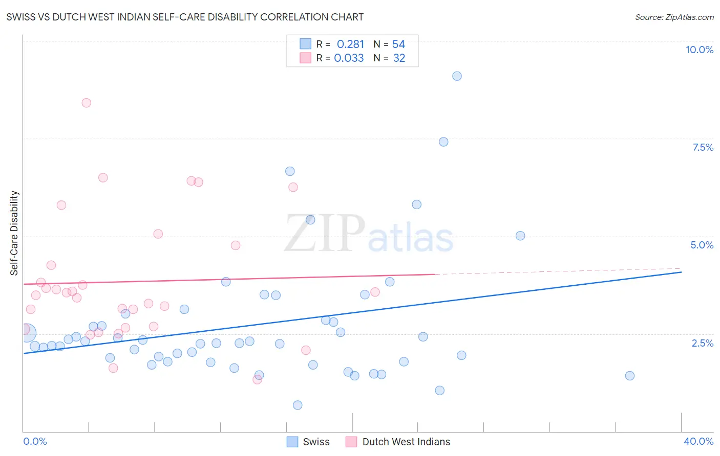 The statistical analysis conducted on geographies consisting of 464,154,677 people shows a weak positive correlation between the proportion of Swiss and percentage of population with self-care disability in the United States with a correlation coefficient (R) of 0.281 and weighted average of 2.4%. Similarly, the statistical analysis conducted on geographies consisting of 85,744,366 people shows no correlation between the proportion of Dutch West Indians and percentage of population with self-care disability in the United States with a correlation coefficient (R) of 0.033 and weighted average of 3.0%, a difference of 26.0%.
